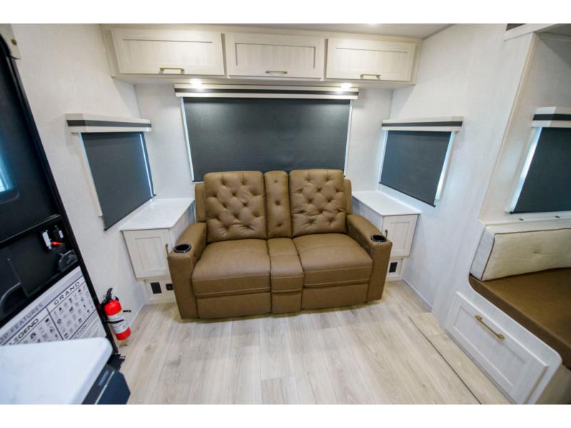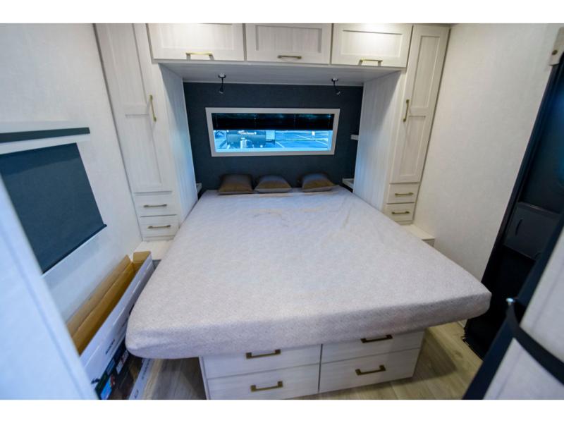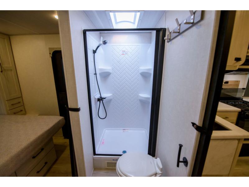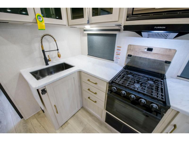 Camping your favorite site has never been more relaxing than in this travel trailer. You can comfortably sleep five to six each night with the custom king bed in the front master bedroom, plus the tri-fold sofa and booth dinette in the rear living area. There is also a walk-through bath that will easily accessible for everyone to use. Whip up your best meals on the residential range, or head outdoors to cook on the gas griddle included within the outdoor kitchen. You'll also find a sink and a refrigerator, and a 21' power awning with LED lights to create the perfect outdoor living space. After a day outdoors, you can relax by the fireplace or watch a movie on the HD TV, and there is a large kitchen pantry to stock up on snacks!