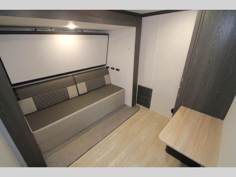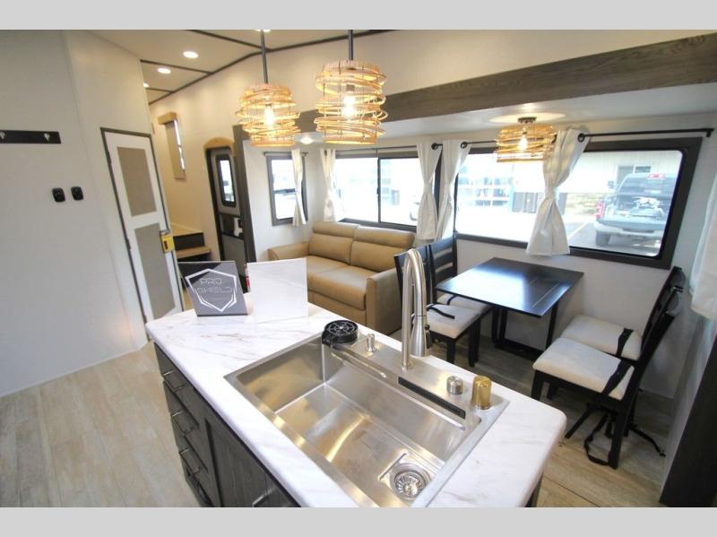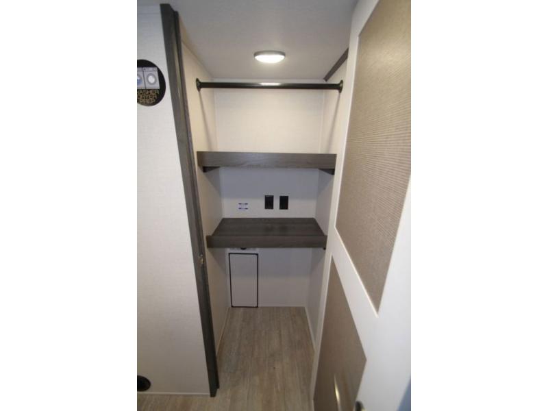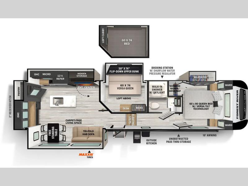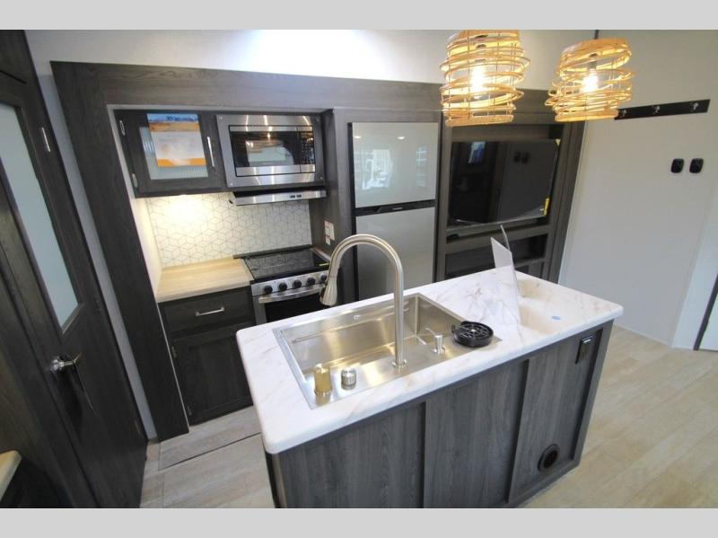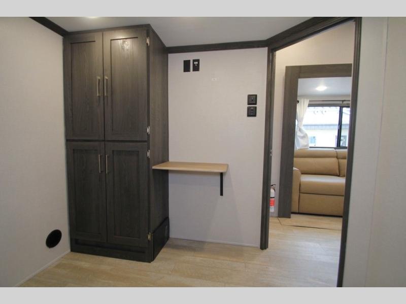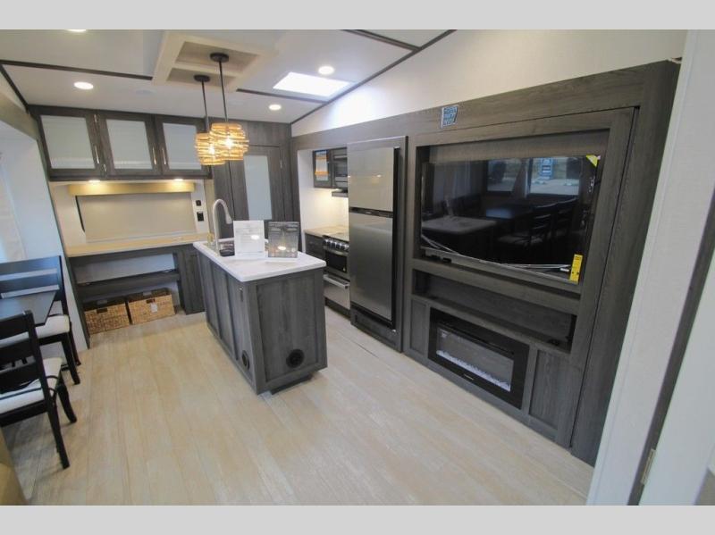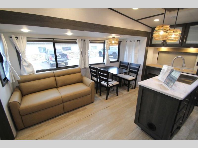 Wow! This fifth wheel will surely make an impression with its middle bunkhouse that can be utilized as an extra bedroom, second living room or even an office thanks to the desk and sofa that becomes a Versa queen bed at night. You will also find a flip-down upper bunk, a slide out for more floor space, and a wardrobe for clothing. The full bathroom is between this room and the front bedroom that offers lots of storage including a slide out wardrobe, a space prepped for a washer/dryer option, nightstands to place your cellphone and such, plus a queen bed with Versa Tilt technology. The rear kitchen includes plenty of storage for your dishes, pans, drinkware, and dry goods. The cook will love the kitchen island, the full amenities as well as the choice to use the outside kitchen to help feed everyone. And the free standing dinette with chairs plus the tri-fold hide-a-bed sofa offer seating inside.