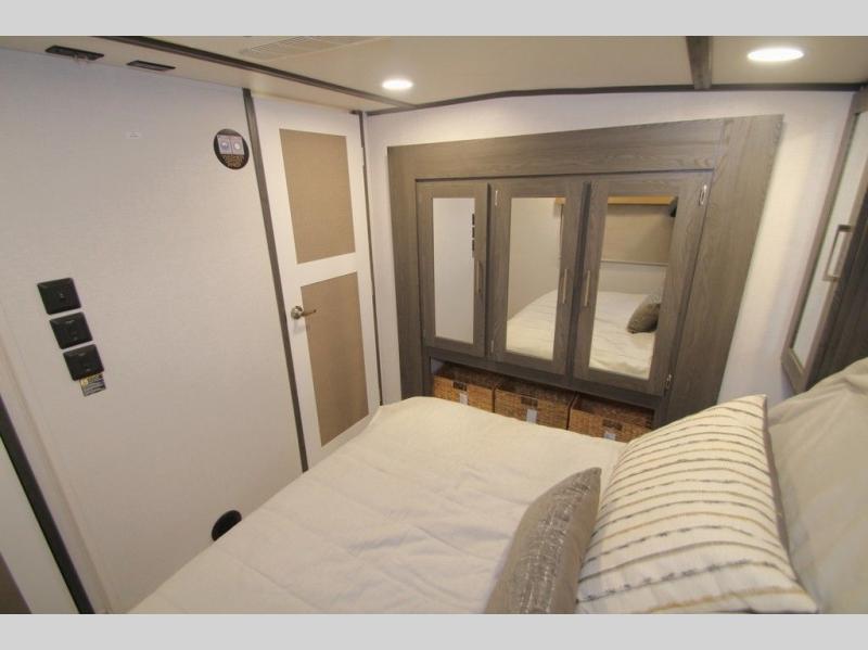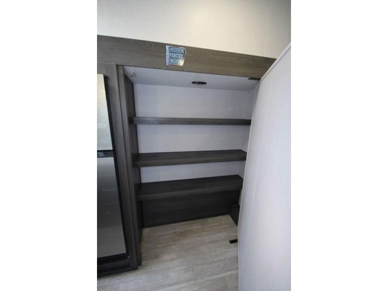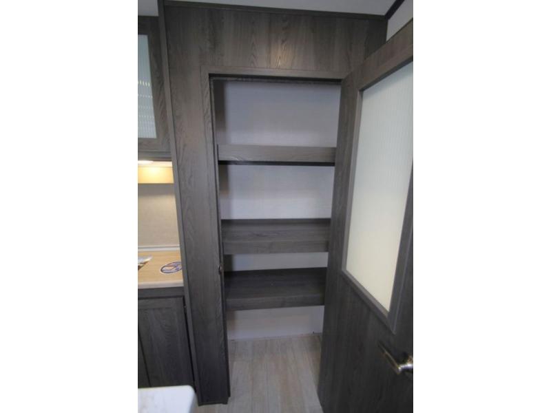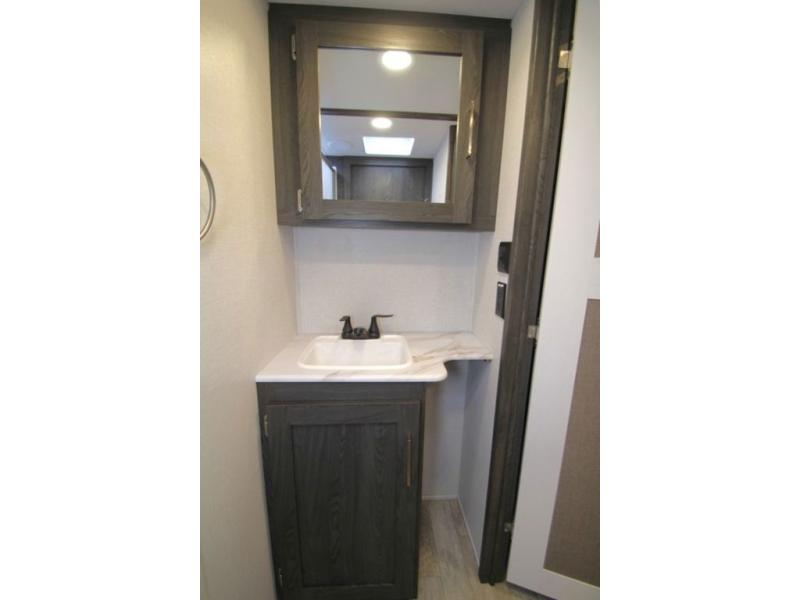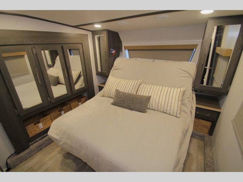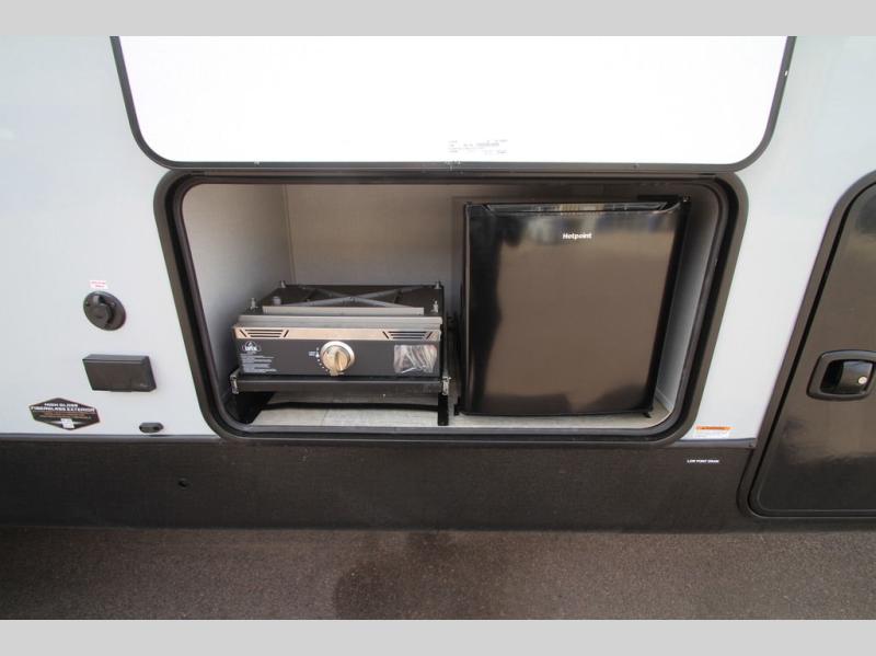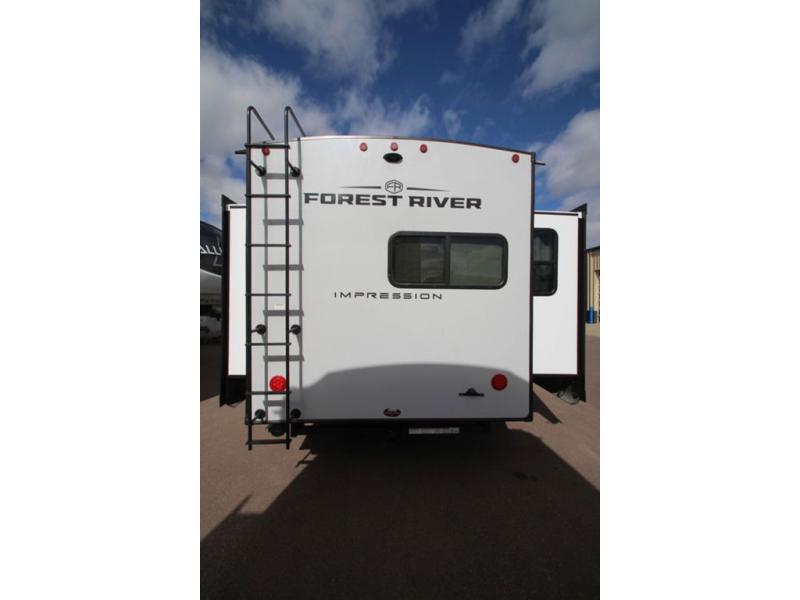 With any Impression mid-profile fifth wheel by Forest River, the focus of the design is comfort and value, built with quality craftsmanship and attention to customer's desires in each Impression! The exterior includes upgraded E-rated MAXXIS tires, custom exterior graphics package, and insulated slam latch baggage doors. There is also an enclosed docking station, an outside shower, and a 100W roof solar panel for off-grid capabilities. The fully heated and enclosed AccessiBelly has removable underbelly panels and offers four seasons of travel, and there is an industry leading 15K A/C plus 35K BTU furnace to keep you comfortable. The interior has lumbercore cabinetry, residential linoleum, residential backsplash in the kitchen, and oversized opening windows in the living area for more natural lighting and good air flow.