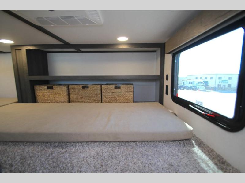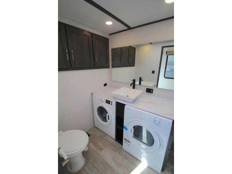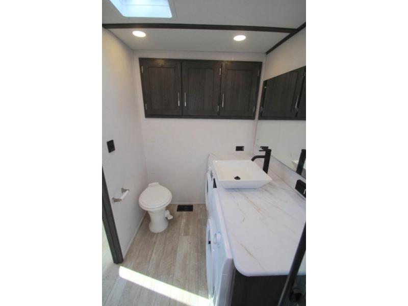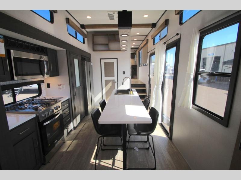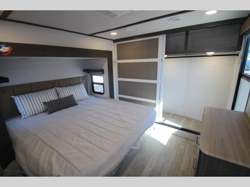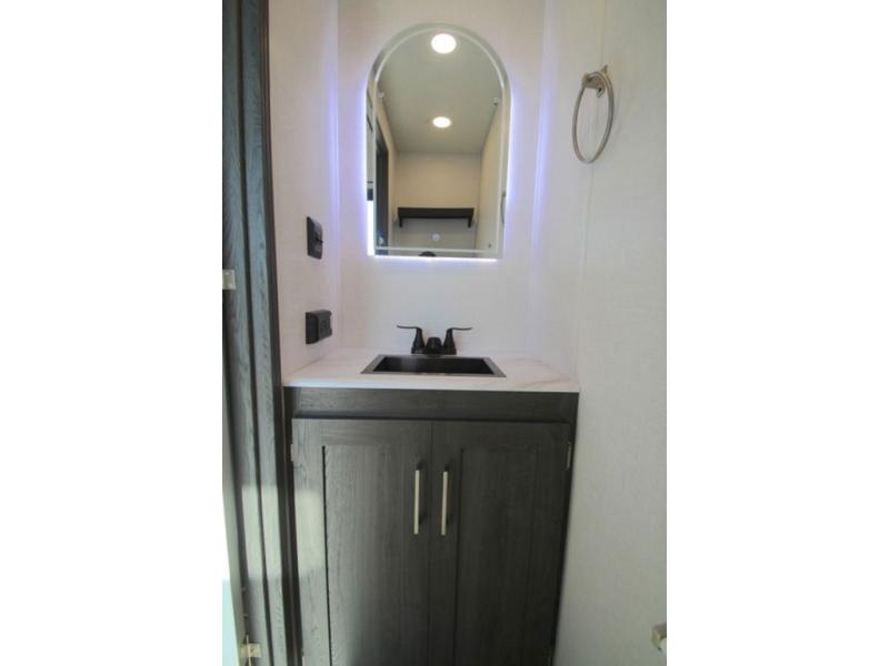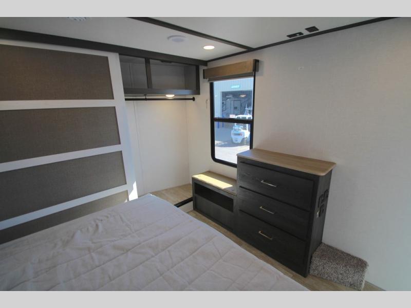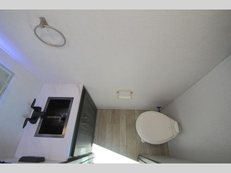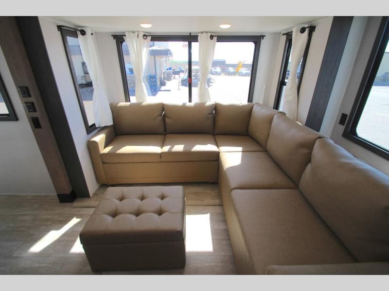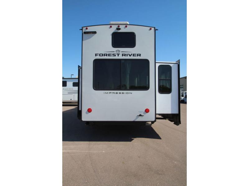 With any Impression mid-profile fifth wheel by Forest River, the focus of the design is comfort and value, built with quality craftsmanship and attention to customer's desires in each Impression! The exterior includes upgraded E-rated MAXXIS tires, custom exterior graphics package, and insulated slam latch baggage doors. There is also an enclosed docking station, an outside shower, and a 100W roof solar panel for off-grid capabilities. The fully heated and enclosed AccessiBelly has removable underbelly panels and offers four seasons of travel, and there is an industry leading 15K A/C plus 35K BTU furnace to keep you comfortable. The interior has lumbercore cabinetry, residential linoleum, residential backsplash in the kitchen, and oversized opening windows in the living area for more natural lighting and good air flow.