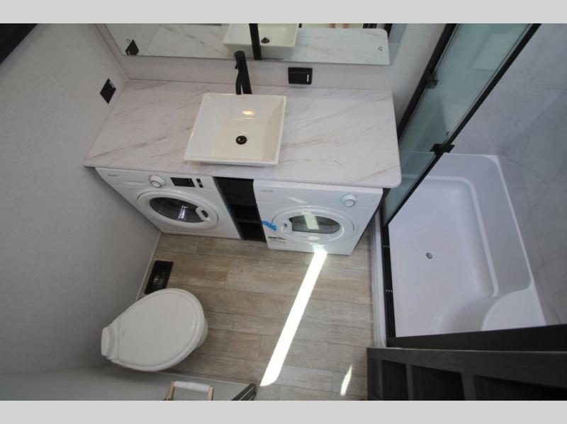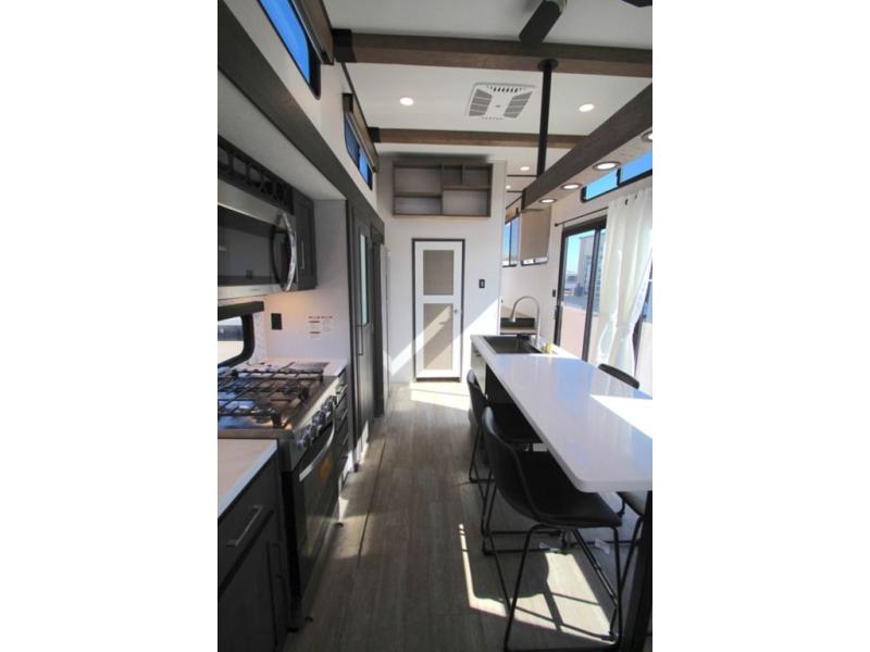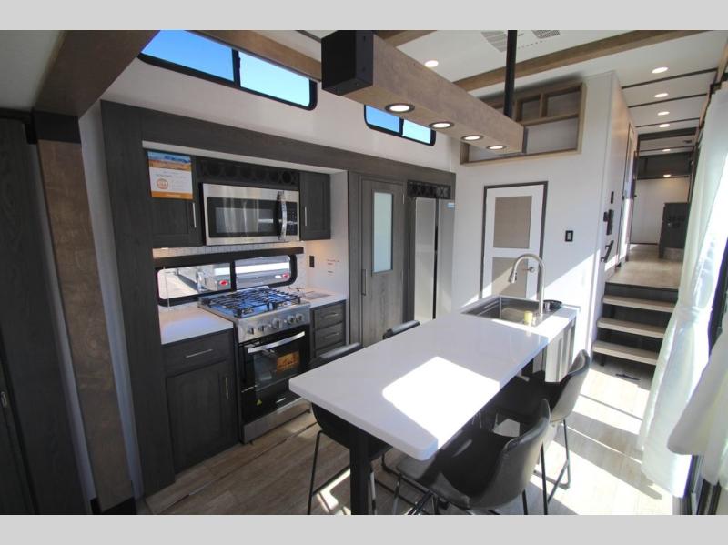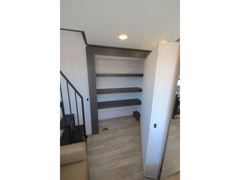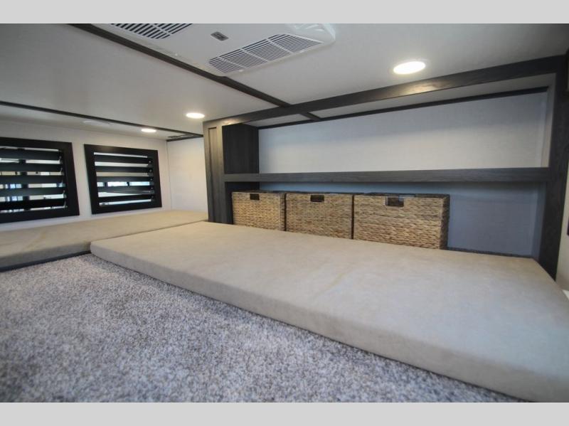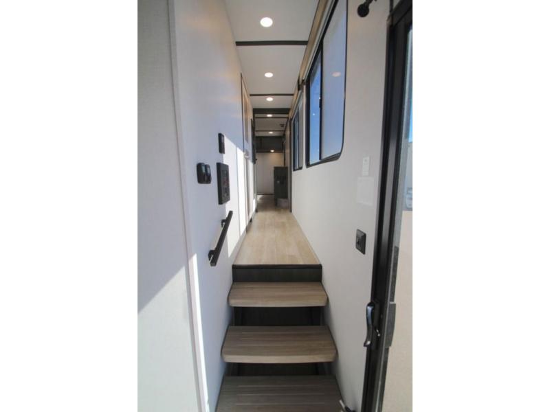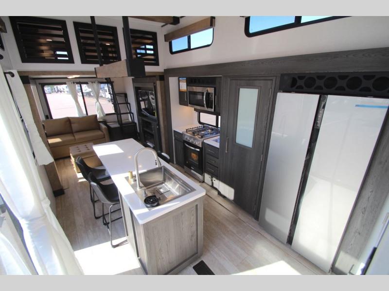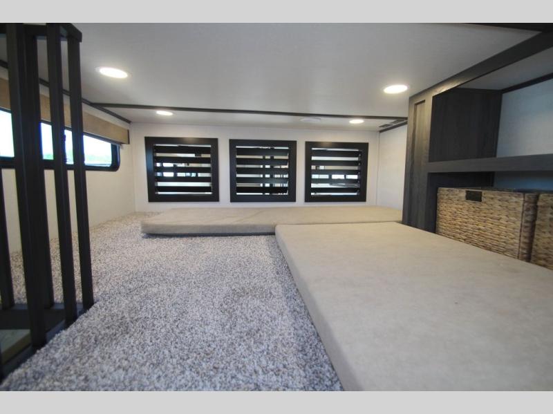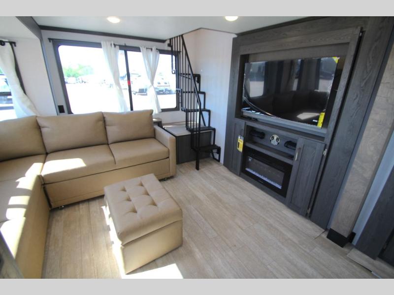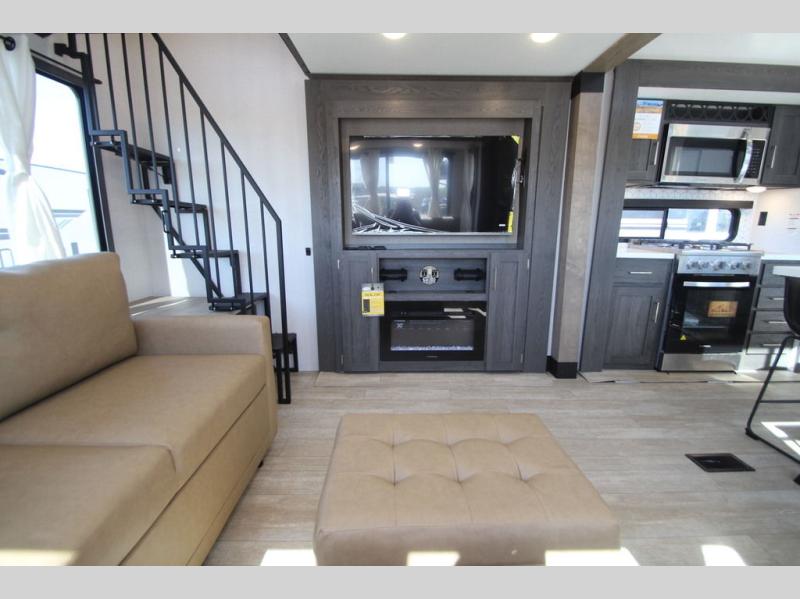 Plan to stay awhile in this four slide out fifth wheel! There is a triple-slide patio door that opens into the kitchen, complete with a kitchen island, walk-in pantry and 16 cu. ft. 12V refrigerator, and a convenient half bath with storage. There are reclining theater seats with a chaise lounge across from an entertainment center and fireplace with hidden storage behind. The fold-up steps lead up to the loft that includes two bunk mats, a wardrobe, cubby storage, plus two windows, which will make this space bright and open. The full bath towards the front includes washer/dryer prep, a walk-in shower with a skylight, and a linen closet to keep towels close by. And you'll love having your own bedroom up front with a king bed with Versa Tilt, a dresser with a bench, and a front wardrobe to keep your clothes wrinkle-free!