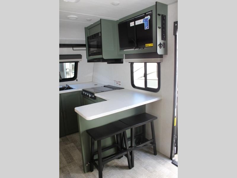 This couple's trailer is perfect for weekend trips or extended stays at the campground. A front kitchen includes generous counter space, along with a bar top and two seats. You can relax on the jackknife sofa slide after breakfast, or head outdoors to sit under the patio awning. The walk-thru bath will lead to the rear master bedroom where you'll find a queen bed and dual wardrobes for your clothes.