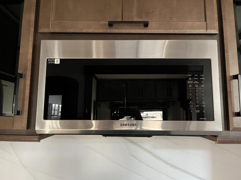 The gourmet kitchen is designed to rival residential kitchens with solid-surface countertops, a large island for prep space, a high-capacity refrigerator, a three-burner cooktop with oven, a convection microwave, and abundant cabinetry. Thoughtful storage solutions and smart layout make meal prep and cleanup enjoyable and efficient, whether you’re cooking for two or hosting dinner for company.