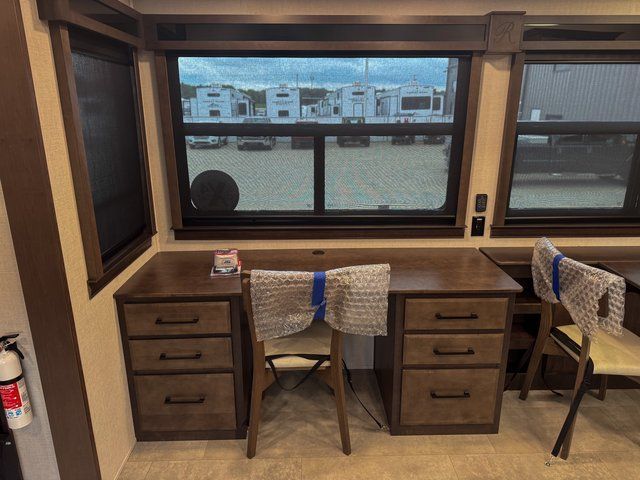 Show your family a good time with this RiverStone fifth wheel! You will get to stay in a super comfortable master suite at the front of this unit which has a dual-sink vanity in the full bathroom. The bedroom offers you a king-size bed that you can rest on while you watch the 40" LED TV across from you, and there is a half bathroom just outside the bedroom for your friends or family to use. If you've decided to bring work with you on the road, you'll be grateful to find a desk in the living area, and the pull-out dinette is a great place to sit down for meals. Work your magic in the kitchen and prepare something delicious on the four-burner range for everyone to eat.