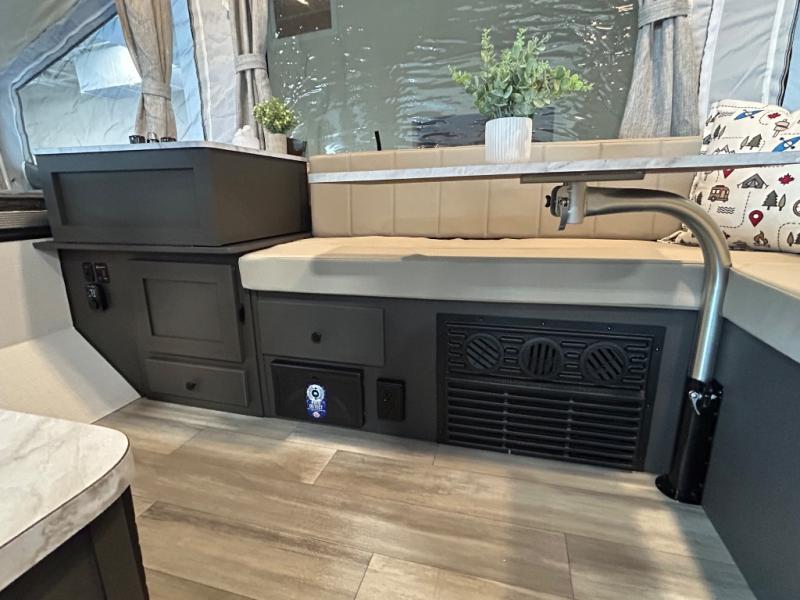 With any Rockwood Freedom Series by Forest River, you will enjoy added features to make each excursion one to remember. These folding pop-up campers feature a fiberglass laminated roof, wood plank flooring, and a Clay exterior with an alloy band. The leaf-spring axles, electric brakes, and balancing bead/nitrogen filled tires will make towing easier than ever, plus there are four stabilizer jacks with sand pads to help keep your unit secure. Each model also includes an awning with LED lighting outdoors, along with a one-piece screen door, two 20 lb. LP bottles, and a power roof lift to have you set up in no-time. Inside, the 15K under-bunk A/C and 20K BTU furnace will help keep you comfortable, and the Create-A-Breeze roof vent fan will keep the air moving!