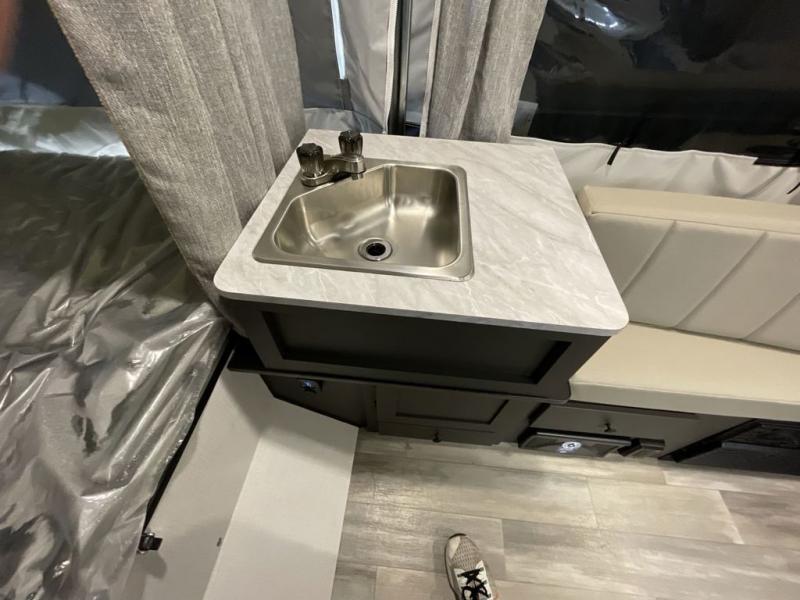 This compact camper will be perfect for outdoor trips to your favorite campground. There are two tent end beds for sleeping space, along with an L-shaped seat with a table for dining space. An extra guest or two little ones could even sleep here at night! The exterior griddle will let you make meals each day, and the 12V refrigerator will keep perishables fresh. This unit also includes an indoor sink so you can wash dishes and brush your teeth at night, and there is a 7' awning outdoors to enjoy some shade!