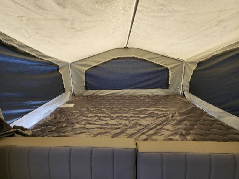This Rockwood Freedom Series folding pop-up camper is going to let you camp in freedom! You will be able to use the permanently mounted three burner range to cook up some delicious food, and the 9' awning with an LED light will keep you protected while you work. You will also find that the booth dinette with added seating will be useful for both meal time and bed time when the two tent end beds aren't enough space, and the storage lid under the front bed provides storage for luggage, blankets, and more!
