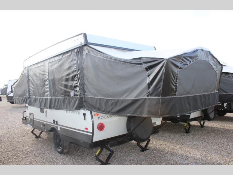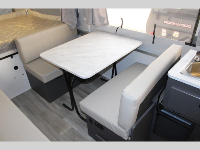 This Rockwood Freedom Series folding pop-up camper is going to let you camp in freedom! You will be able to use the outdoor griddle to cook up some delicious food, and the 11' awning with an LED light will keep you protected while you work. You will also find that the booth dinette will be useful for both meal time and bed time when the two tent end beds aren't enough space, along with the gaucho bed. This camper also includes a front deck storage with expanded metal decking for all your camping gear!