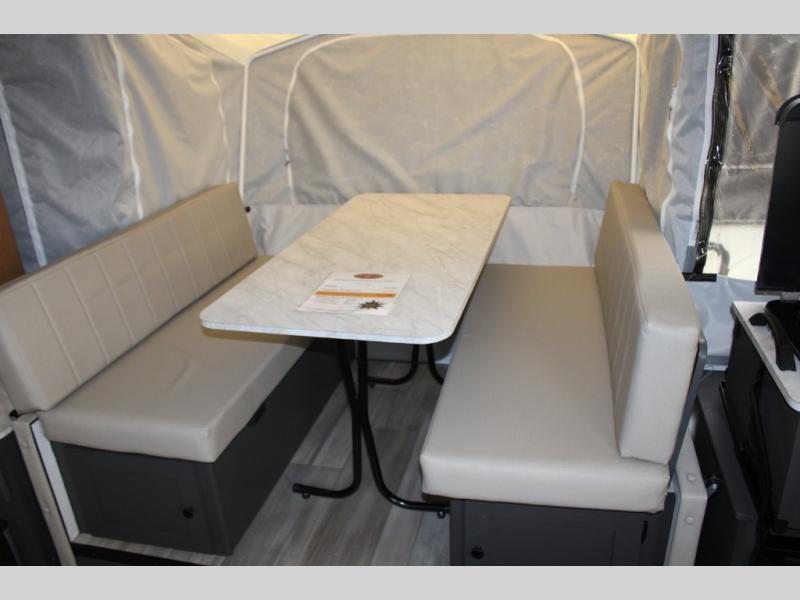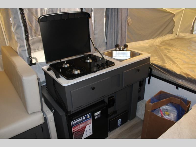 You won't have to worry about length restrictions or cumbersome towing because this Rockwood Freedom Series folding pop-up camper provides you with a lightweight and flexible alternative to heavy RVs! This camper has a single slide built into it which will deliver extra space to the interior without adding to the overall width while traveling, and the booth dinette is a functional piece of furniture that can serve as a dining table and a bed. The swing galley includes a three burner range with a cover to cook meals and a sink for easy cleaning. There is also a shower/toilet to make this unit even more convenient.