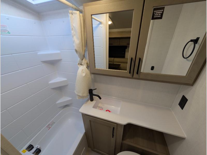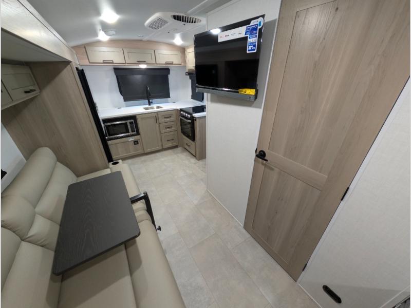 Are you looking for a lightweight trailer with at-home comforts? Take a look at this single slide out unit that can sleep three to four each night. There is a queen-size bed in the back with a 26" x 80" flip-up bunk for cozy sleeping space, a 72" sofa with cupholders to relax on, plus a 32" 12V TV for movie nights! The front kitchen includes a 12V refrigerator to store food, plus a microwave oven and a gas oven to cook meals each day.