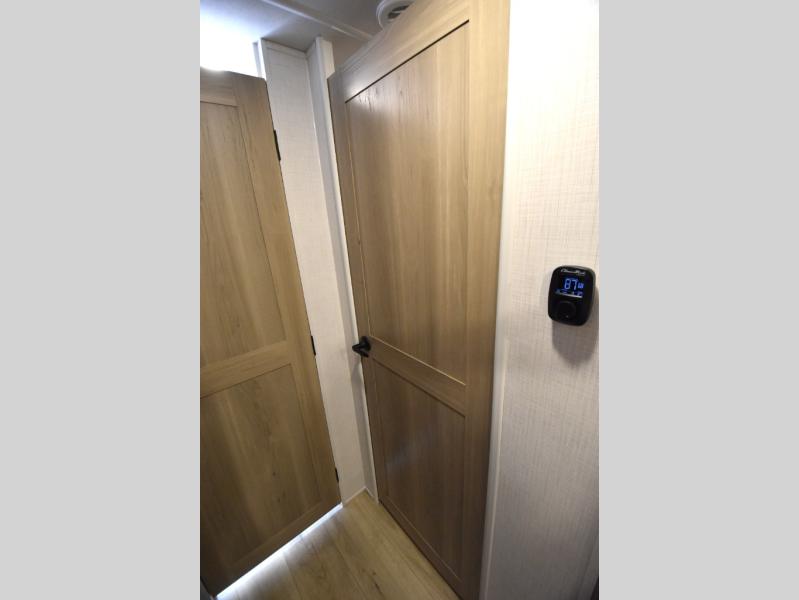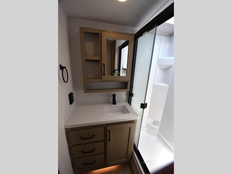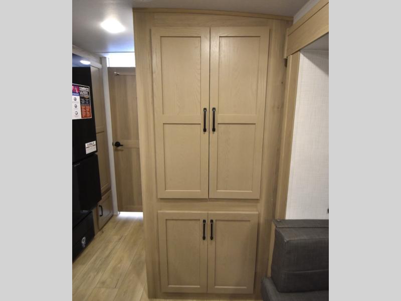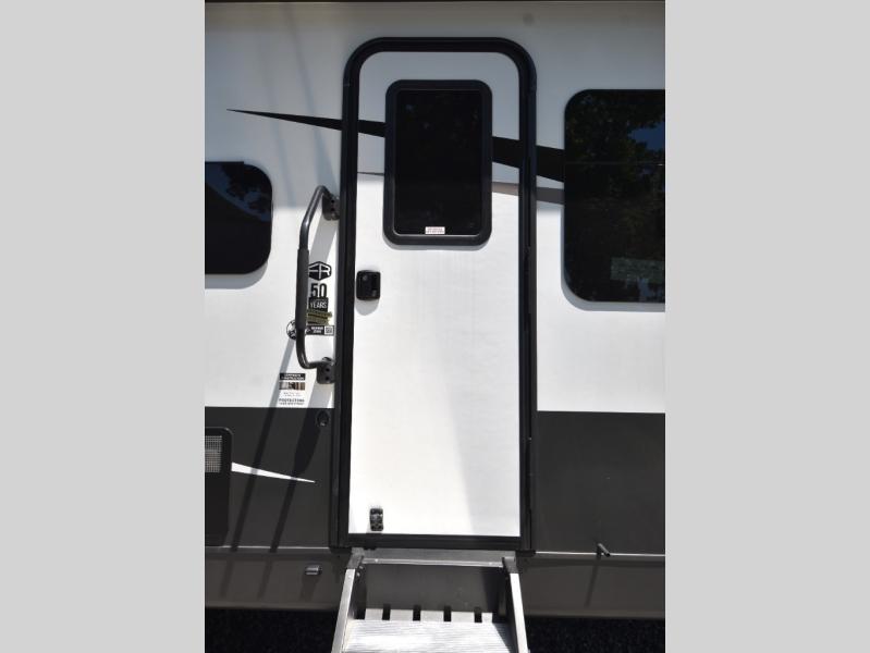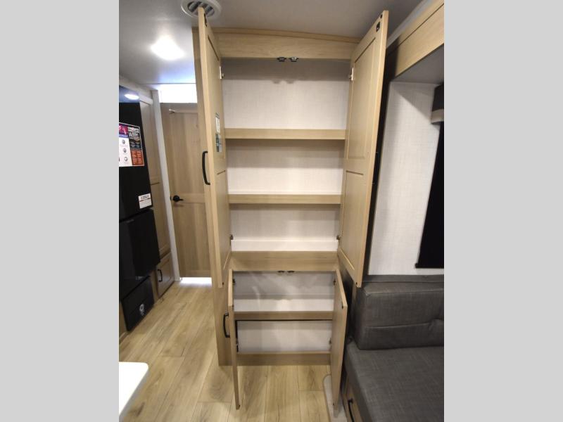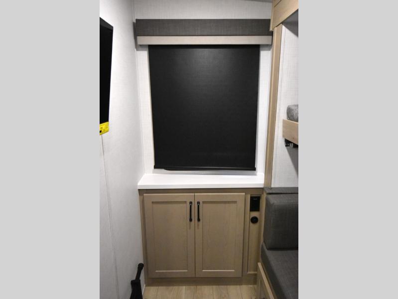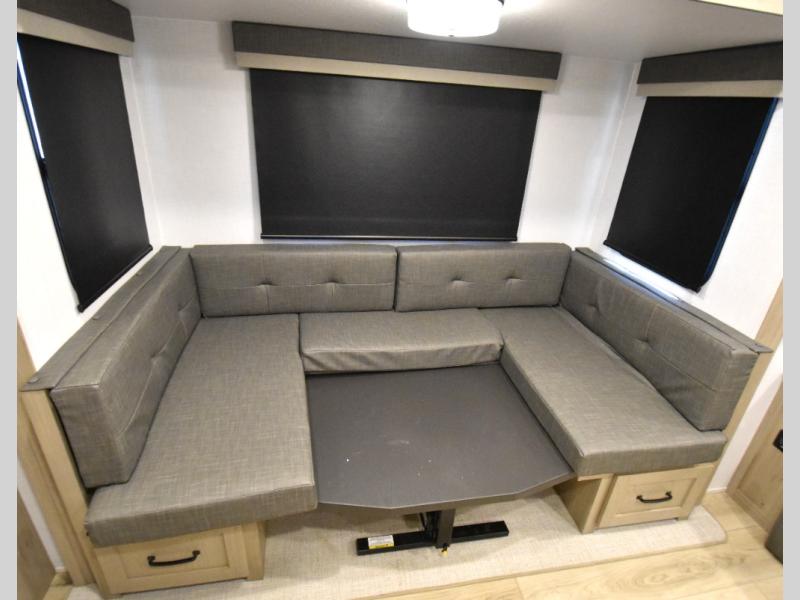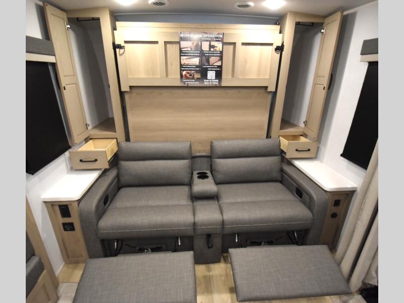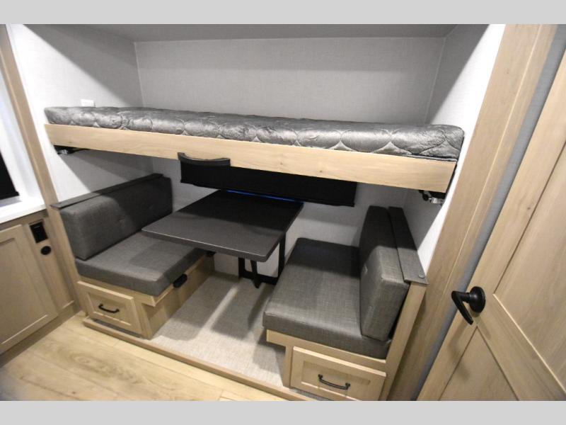 This trailer is one the whole crew will love! Start unloading the pass-thru storage when you arrive at your campsite, then put out the 18' power awning and start lunch on the exterior griddle. There is a full bath inside when you need to freshen up, and the fully-equipped interior kitchen can be used if the weather isn't cooperating with your plans. A U-shaped dinette slide provides a place to dine together and play board games, and two guests can sleep here at night. Speaking of nighttime, there is also a private bunkhouse in the back with a Dream Dinette and flip-up bunk plus a slide out for more space and an optional TV. You'll find your own space up front on the RV queen Murphy bed, complete with dual wardrobes and a privacy curtain when you need to get dressed. And in the morning you can fold away the bed to relax on the 74" sofa!