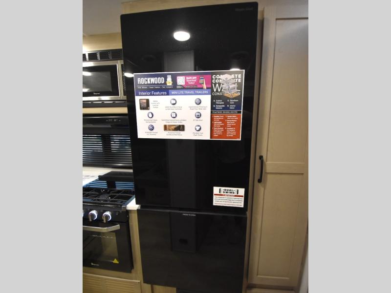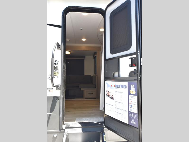 Each Rockwood Mini Lite travel trailer by Forest River is constructed with a fully laminated one-piece walkable roof, sleek frameless windows, and a six-sided full aluminum frame for strength and durability. The 12V thermostatically controlled heated tanks, plus radiant foil in the underbelly and slide out floors will allow you to camp well into the colder months, and the 200W roof solar panel will be perfect for a little off-gridding. Each model includes solid surface kitchen countertops, solid wood cabinet doors, night roller shades, plus many more interior features. Having an AIR 360+ omnidirectional antenna with WiFi prep on board gives you the option to get some work done if it's needed, and the power tongue jack provides hassle-free set up, so you can enjoy more time relaxing!