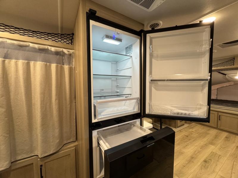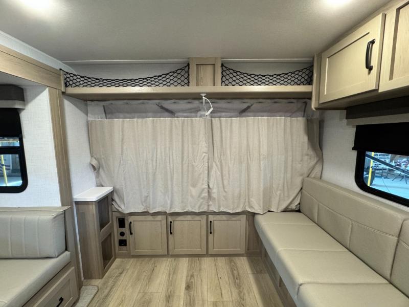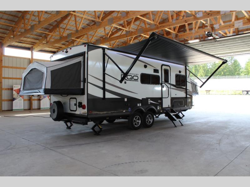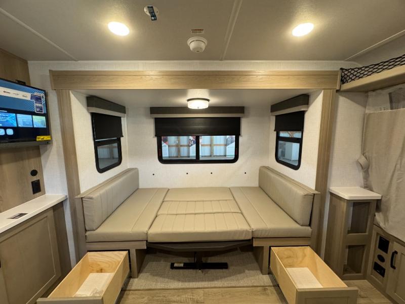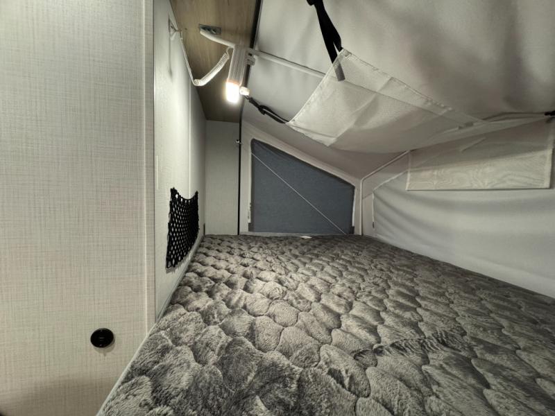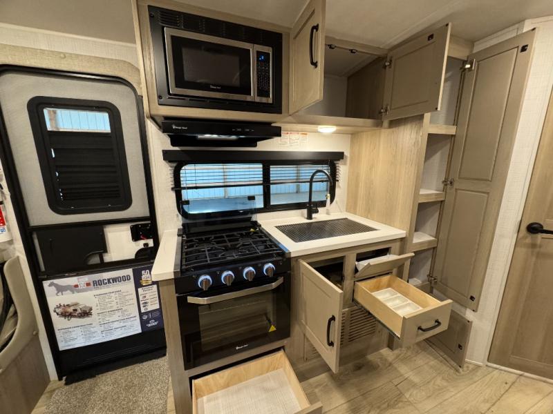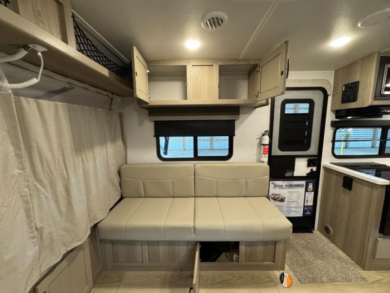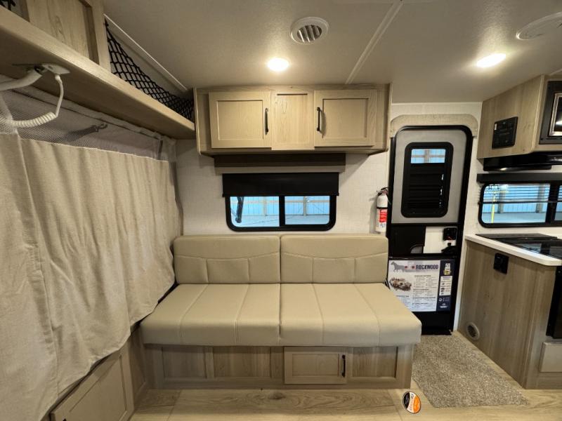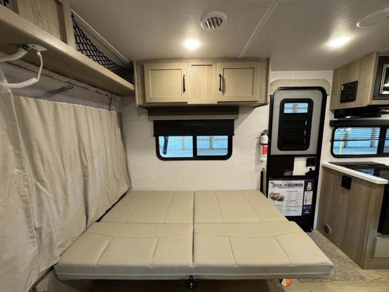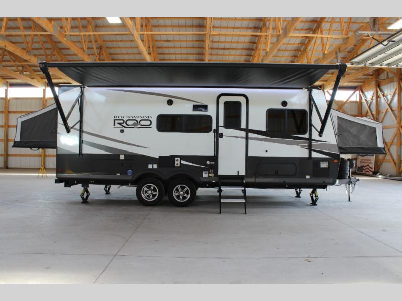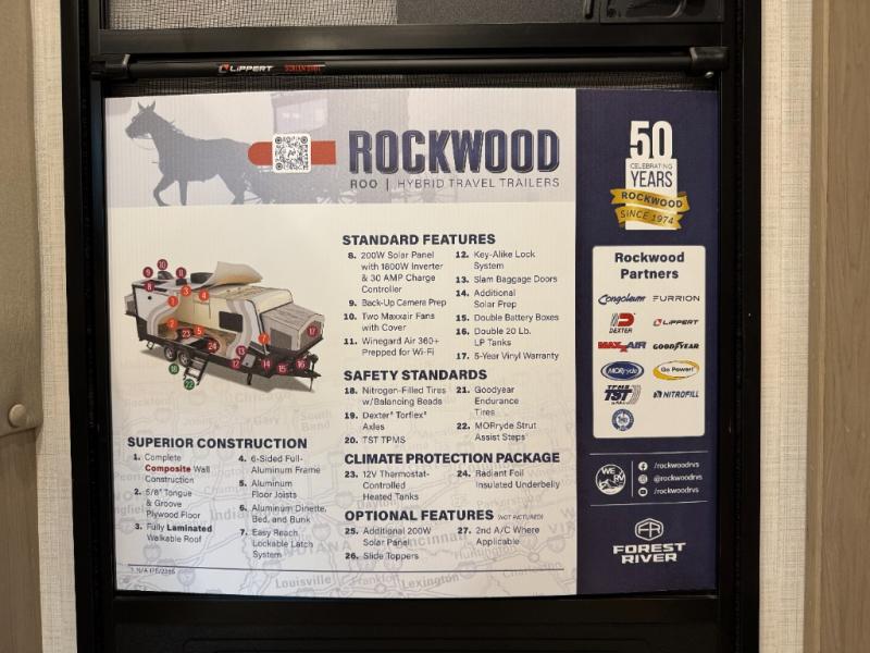 With any Rockwood Roo expandable travel trailer by Forest River you will enjoy smooth towing thanks to the torsion axle, Rubber-Ryde suspension, the easy lube axles and Nev-R-Adjust brakes. The key-Alike locks provide easy access in and out of your trailer, and each model includes prep for a Air 360+Omnidirectional antenna with WiFi for all your connection needs. Each model is constructed with a vacuum laminated one-piece roof and walls, an enclosed underbelly, and tinted framed windows for a more sleek look. You will enjoy many interior comforts, including hardwood cabinet doors and drawer fronts, night roller shades, a bunk/fan light combo with each bed, and much more!