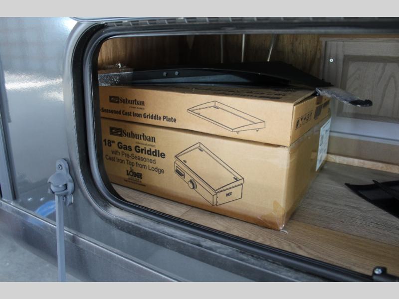 Your family will love this spacious travel trailer that can sleep up to nine people each night. There are triple queen tent end beds, a U-shaped dinette, plus a flip-up sofa for comfortable sleeping space. The chef of the group will have a 12V refrigerator and a pantry to store all the food, plus there is an exterior griddle for breakfast outside. This model also includes convenient exterior storage for fishing poles, tackle boxes, and your luggage!