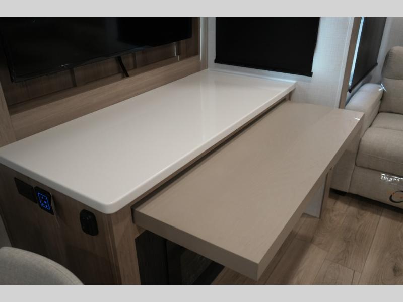 Pull-out desk provides an ideal workspace for telecommuting or study