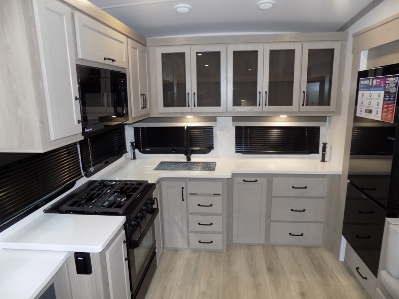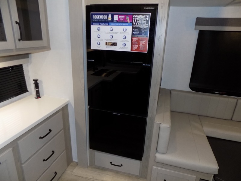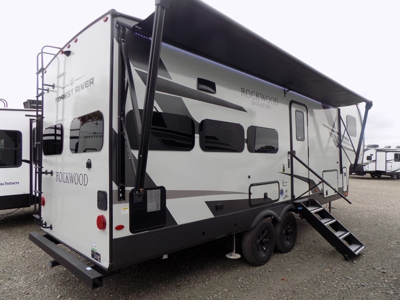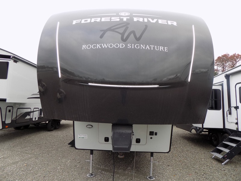 With any Rockwood Signature fifth wheel or travel trailer by Forest River RV, you will enjoy superior construction that includes laminated white fiberglass sidewalls, a radius roof with vaulted interior ceilings, plus radiant foil insulation and an enclosed underbelly for use in all types of weather. Some convenient exterior features include Keyed Alike locks, a rear ladder, a 200W solar panel, and a tire pressure monitor system with a monitor for added safety. The interior offers a One Touch OneControl panel with WeRV app control, for lights, awning, slides, water heater and more, and the Air 360+ omnidirectional antenna with WiFi prep lets you work while away from home if needed. You will also appreciate the interior vaulted ceilings, residential soft close doors and drawers, solid surface kitchen countertops, and designer kitchen backsplash!