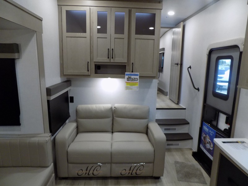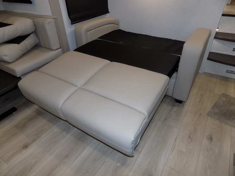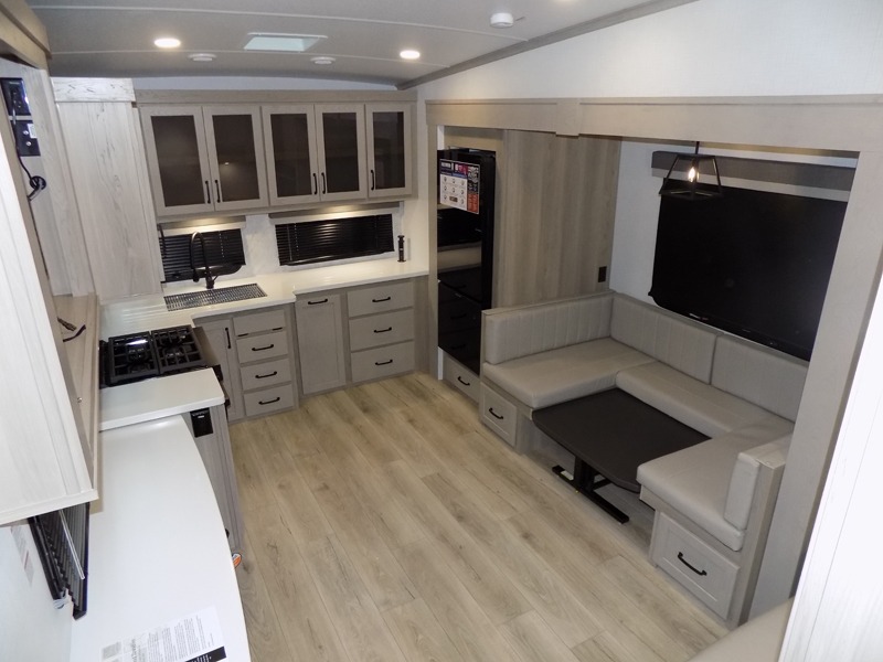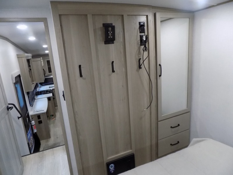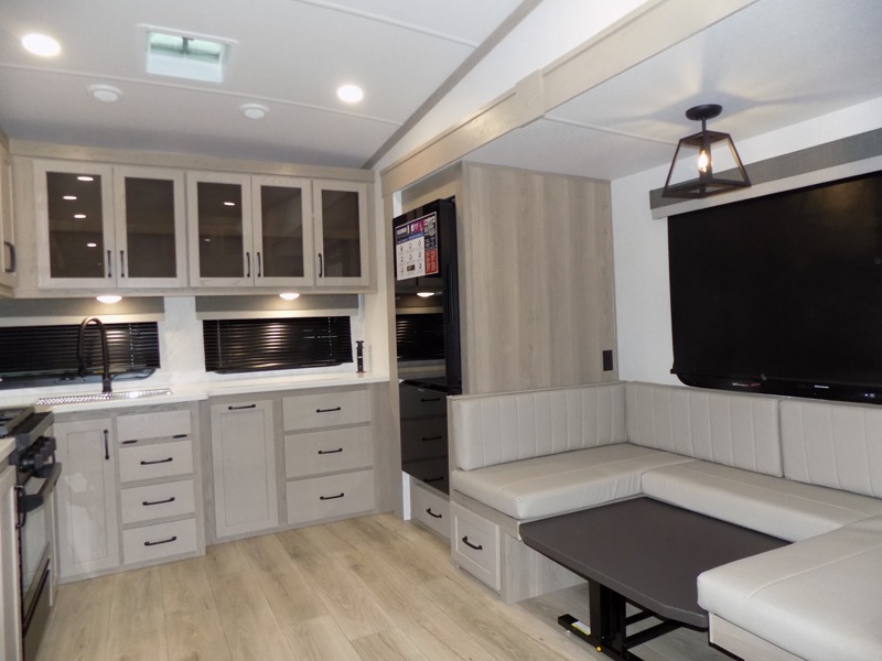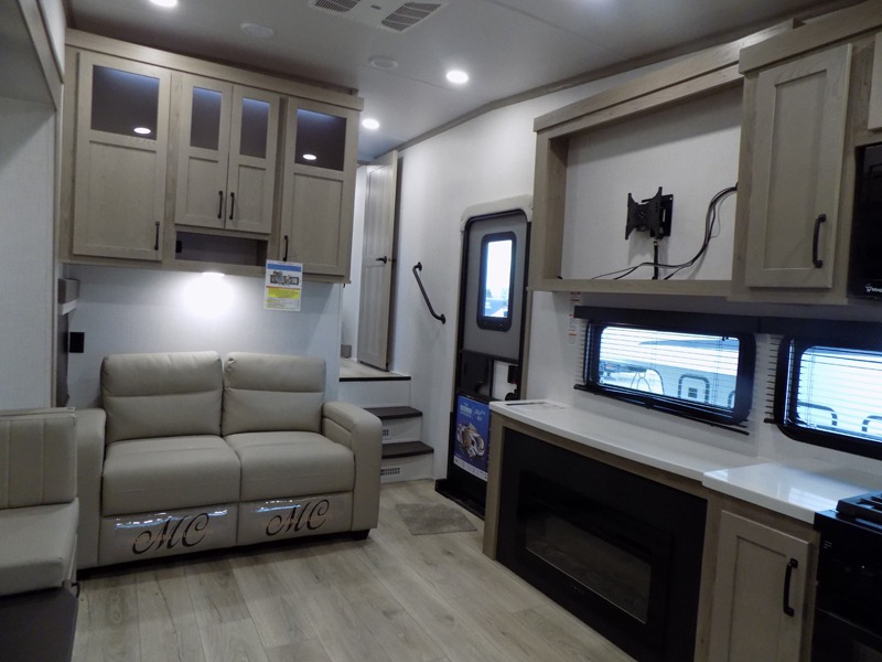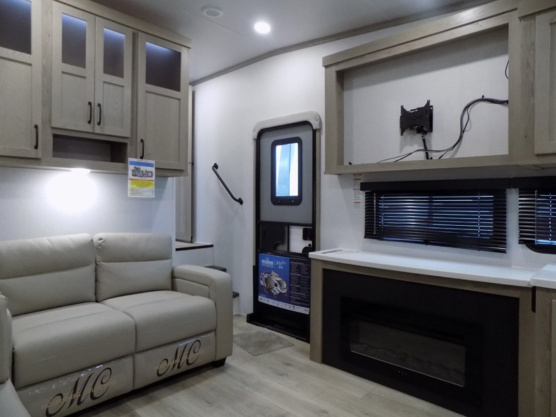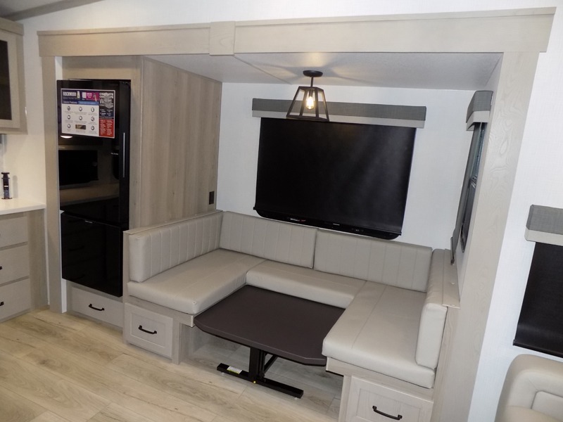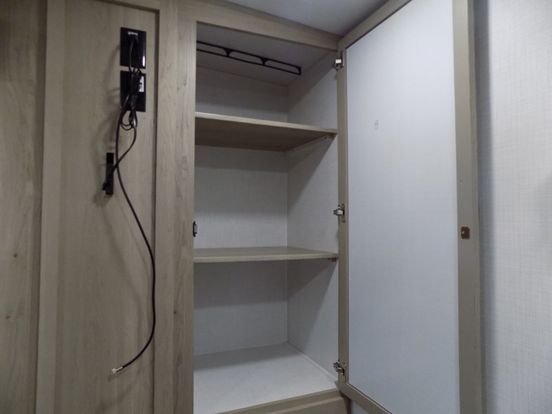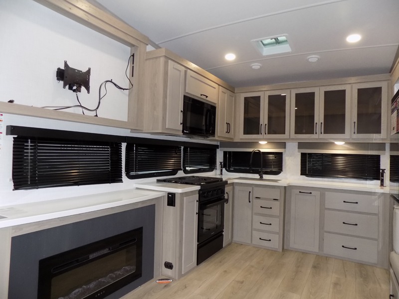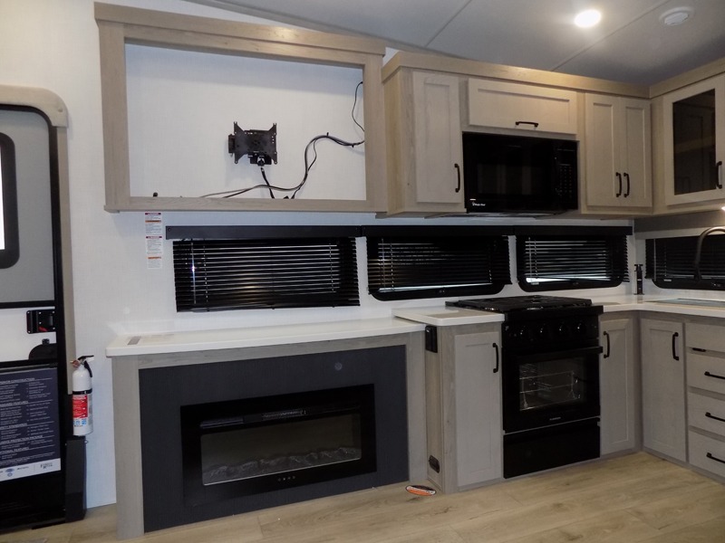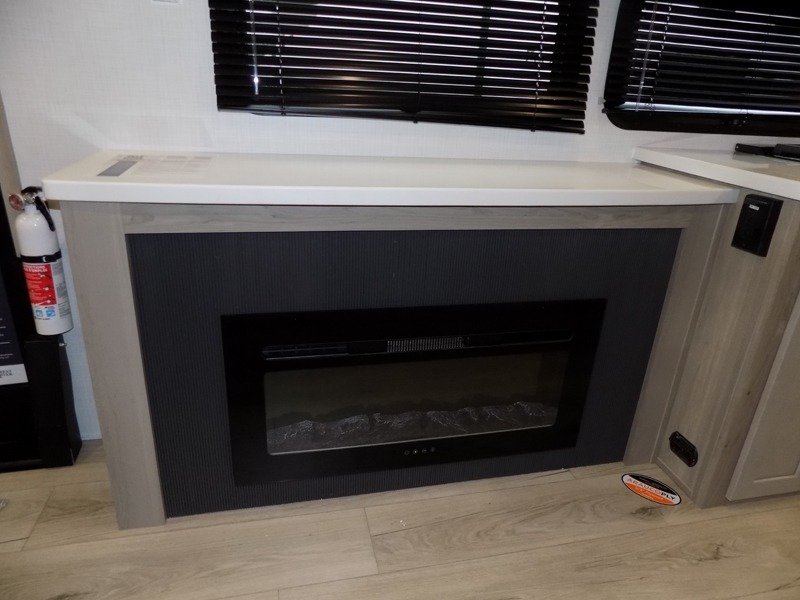 Why not have enough space for all your RVing friends to visit when you camp? This RV offers the perfect living and kitchen area with a large slide giving everyone more floor space, plus there is a king U-shaped dinette and a hide-a-bed sofa to sit on, a fireplace to enjoy and a Smart TV to watch a game or movie together. The cook will love the rear kitchen with extra counter space along a side wall to leave all the snacks and treats for everyone. You might even take everyone outside to enjoy the 21' power awning that offers an outdoor living area with some protection and LED lighting; just grab your camping chairs from the pass-through storage. At night, you can retire to the front bedroom with a queen bed, a spacious wardrobe, plus a TV option if you enjoy movies in bed!