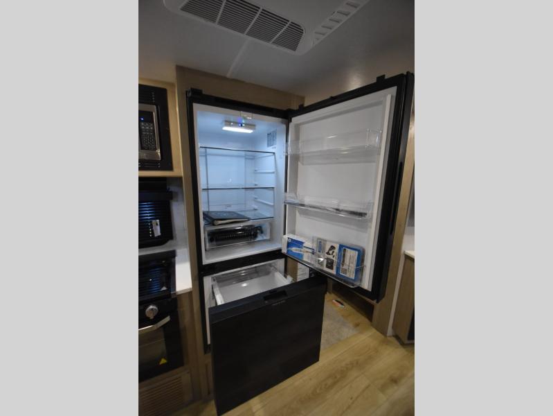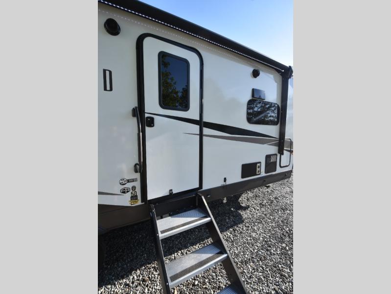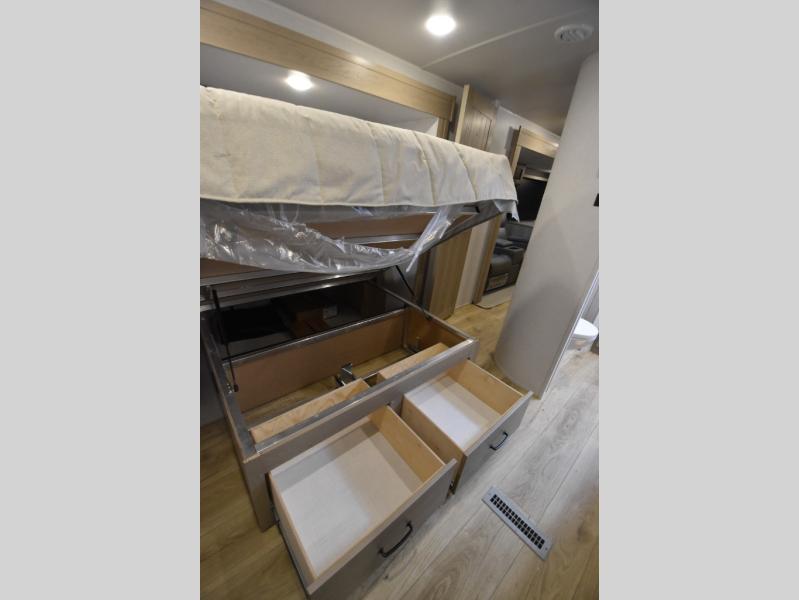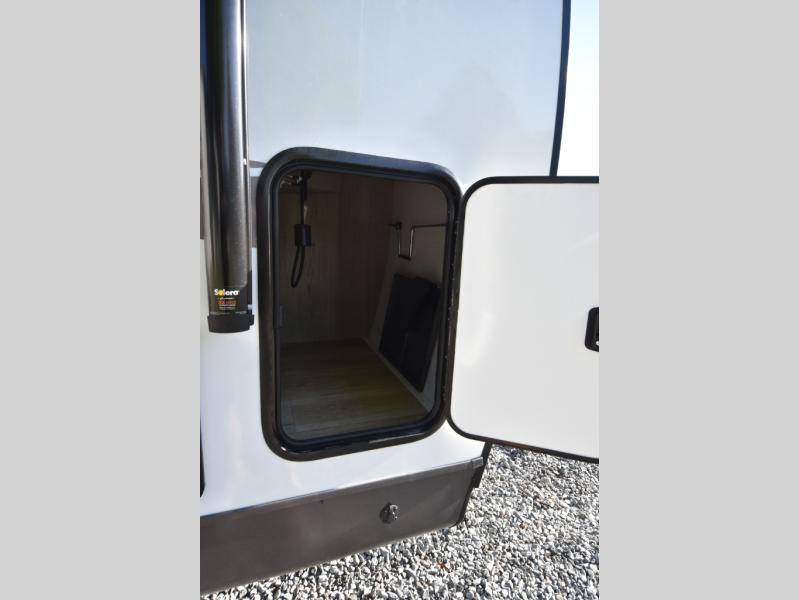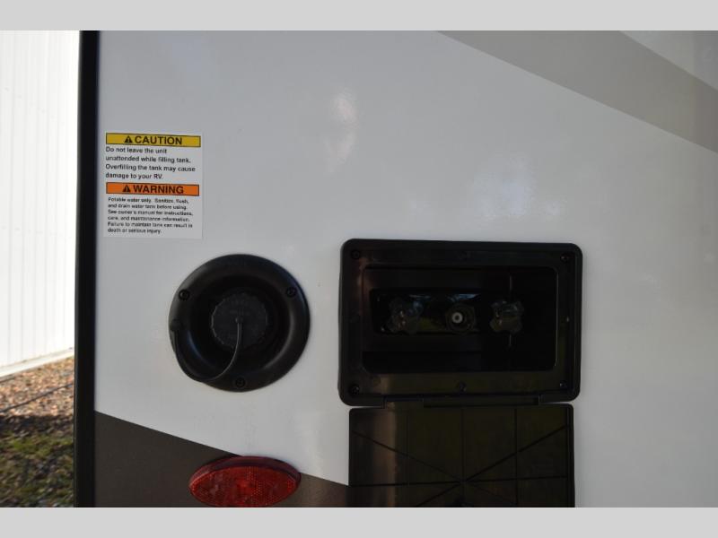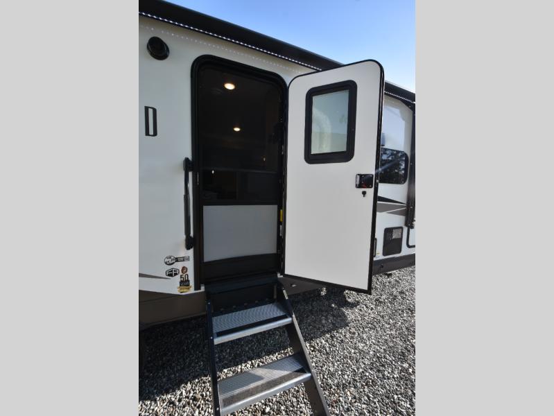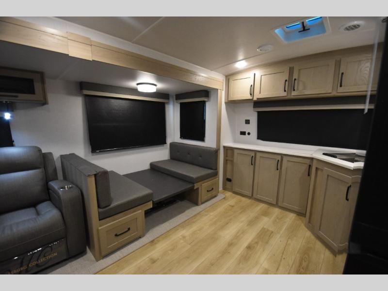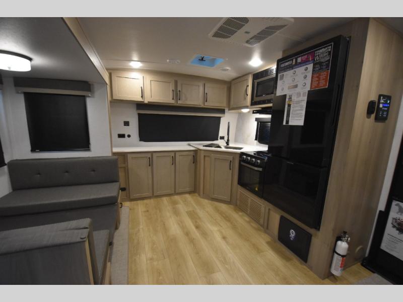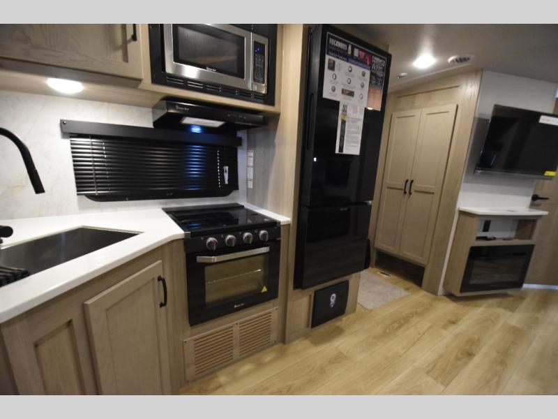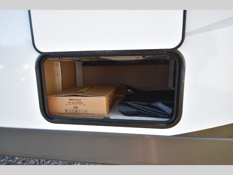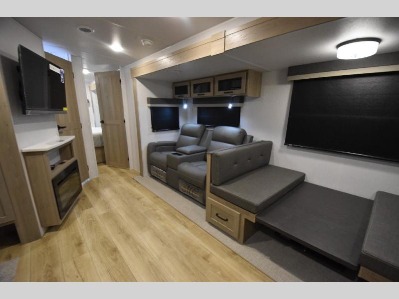 When you are outside this trailer you can enjoy the protection from the 21' power awning, and whip up a meal using the outside griddle. You will find exterior storage for your extra gear, and a ladder at the rear. You get to choose which entrance to step up into, be it the spacious rear bedroom with a queen bed slide and a wardrobe, or the main entry into the kitchen and living area. The furniture slide includes a booth dinette to eat your meals at, and theater seating to watch the Smart TV with a fireplace below. And the cook will love the front kitchen with extra counter space, a three burner range, plus a 12V refrigerator and pantry for food storage!