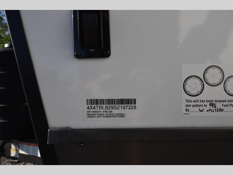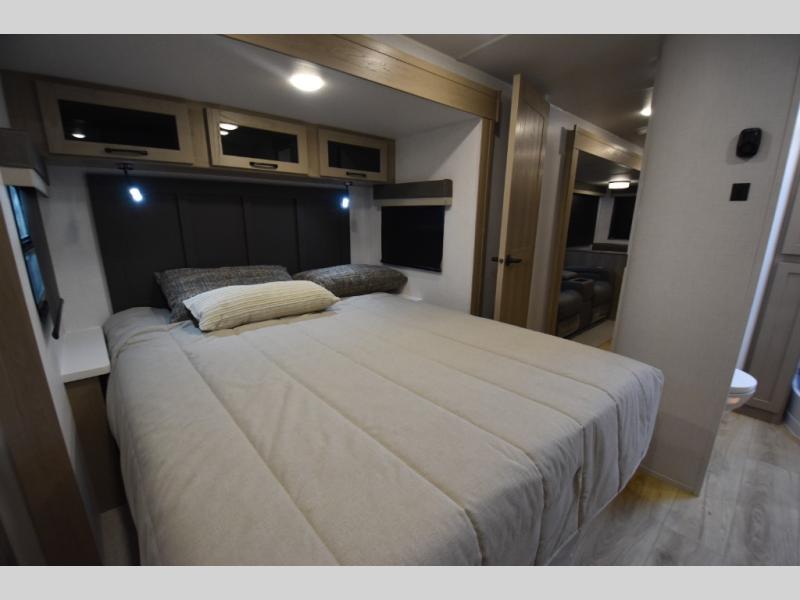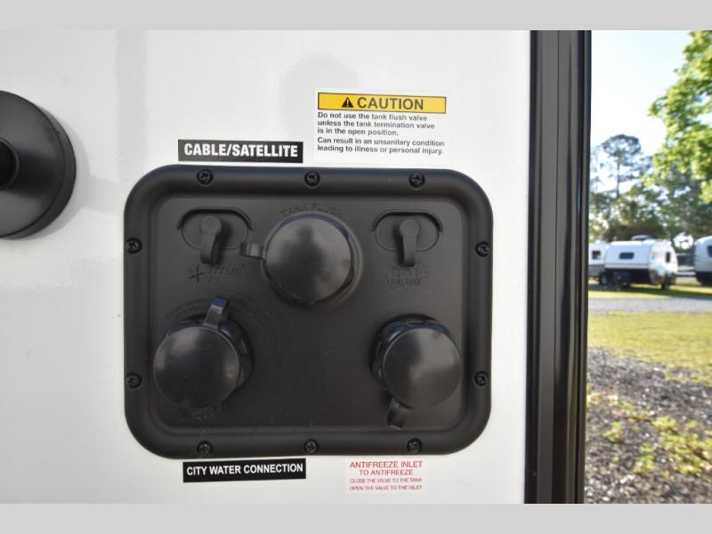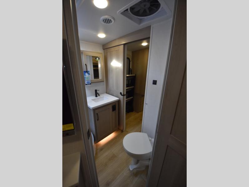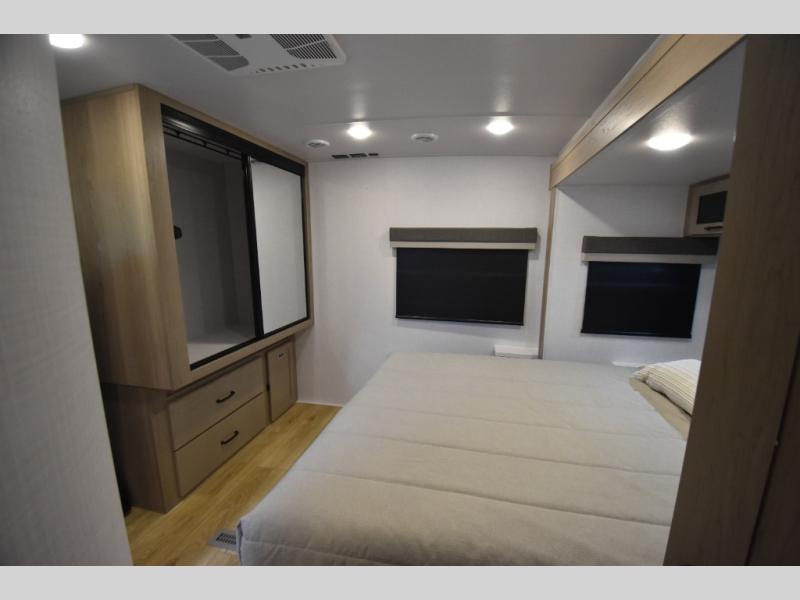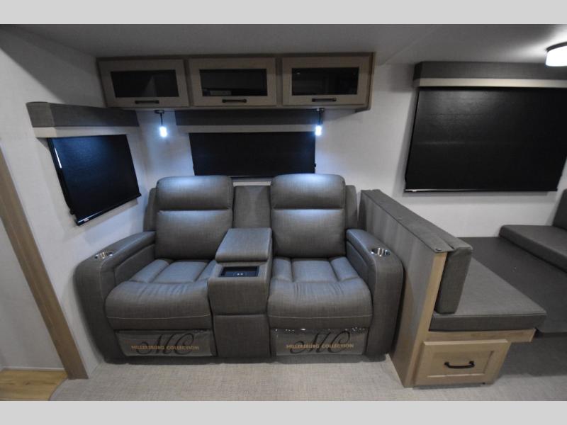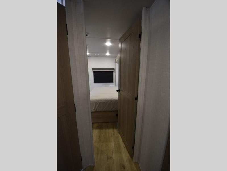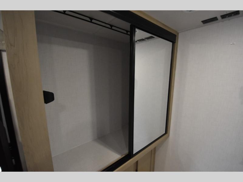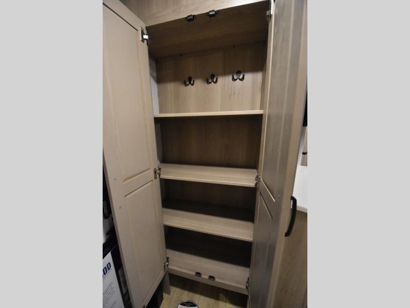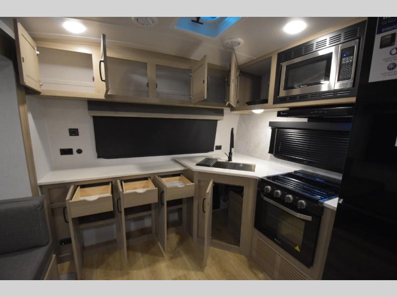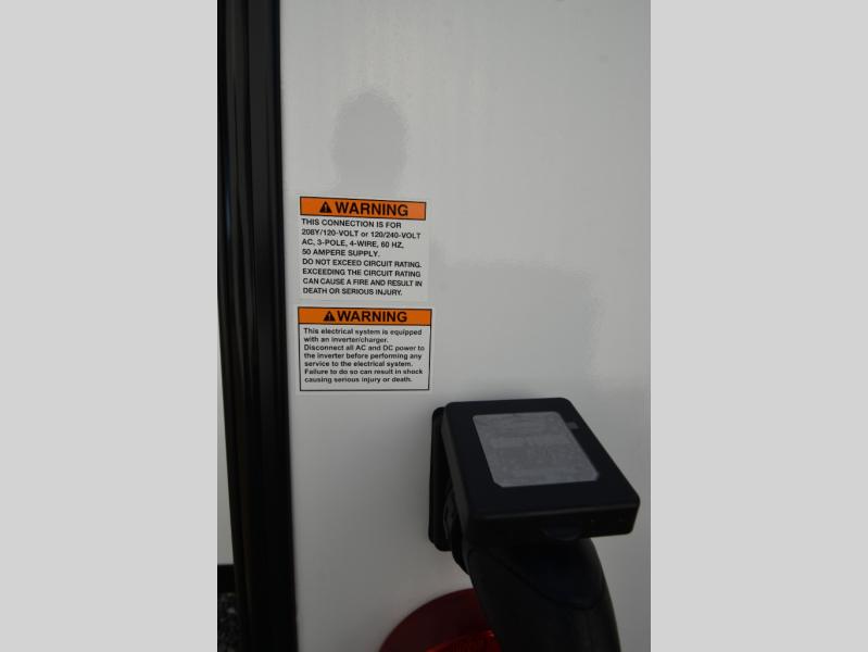 When you are outside this trailer you can enjoy the protection from the 21' power awning, and whip up a meal using the outside griddle. You will find exterior storage for your extra gear, and a ladder at the rear. You get to choose which entrance to step up into, be it the spacious rear bedroom with a queen bed slide and a wardrobe, or the main entry into the kitchen and living area. The furniture slide includes a booth dinette to eat your meals at, and theater seating to watch the Smart TV with a fireplace below. And the cook will love the front kitchen with extra counter space, a three burner range, plus a 12V refrigerator and pantry for food storage!
