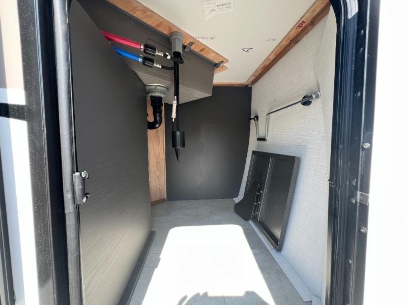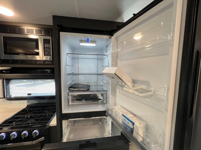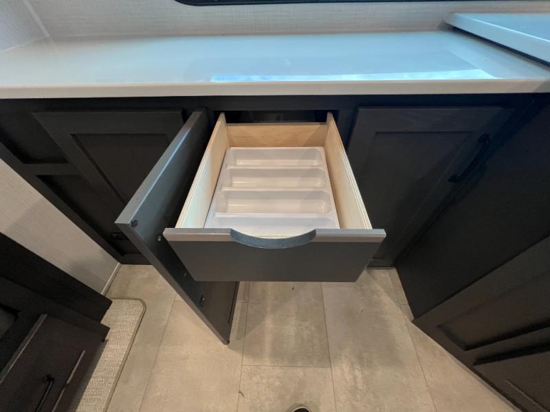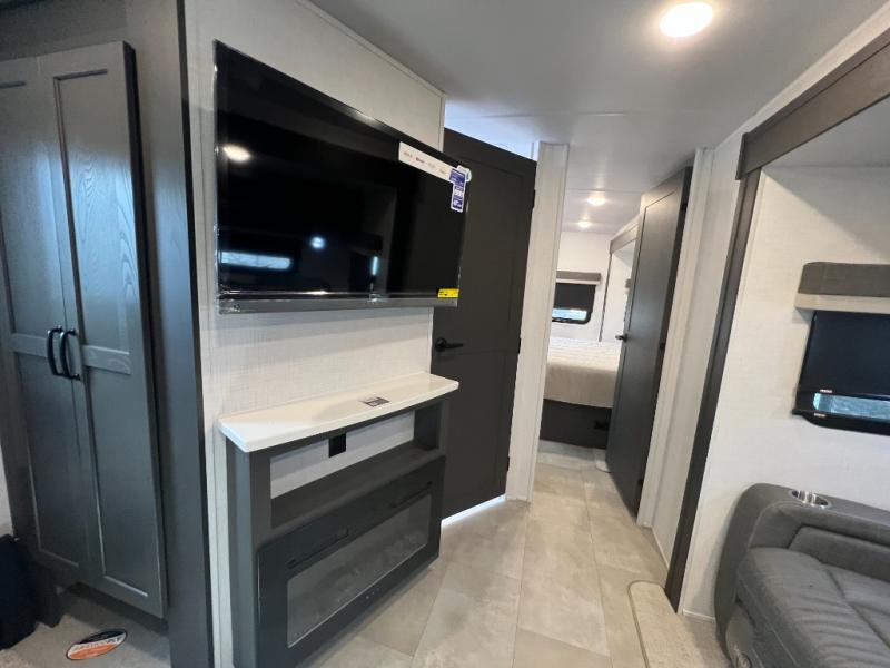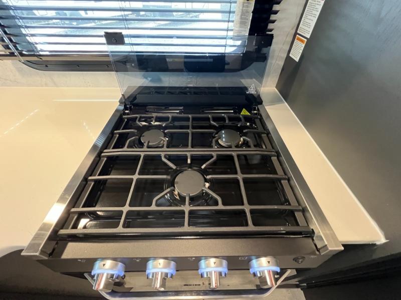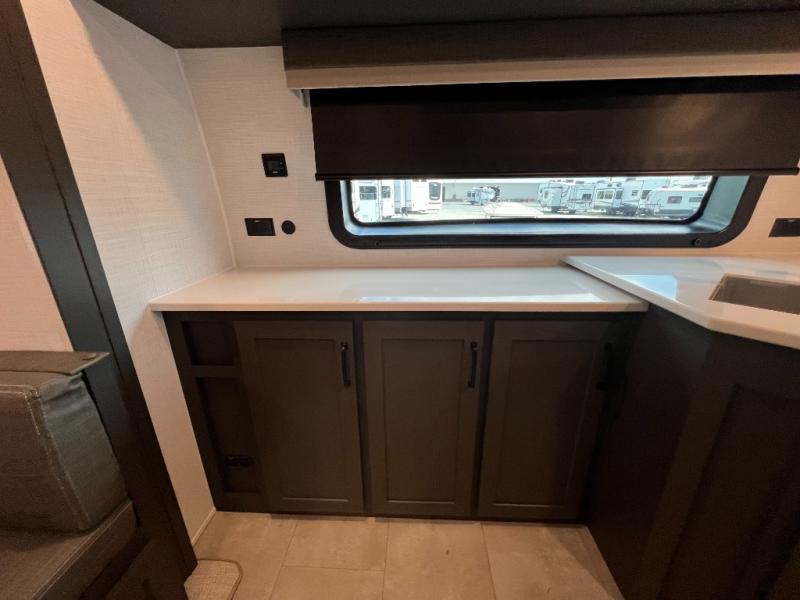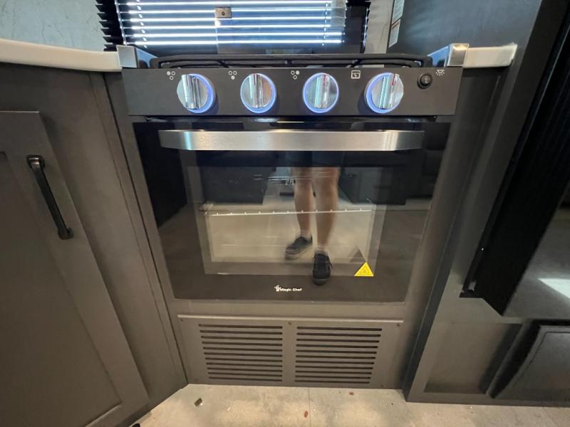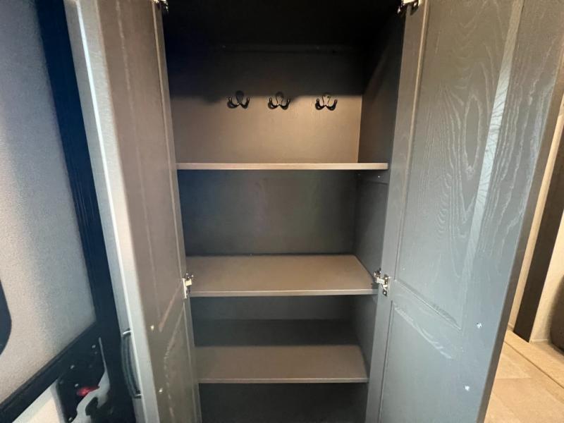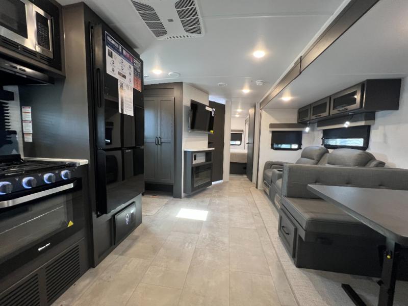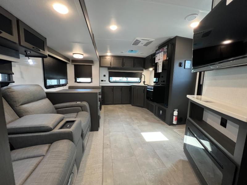 When you are outside this trailer you can enjoy the protection from the 21' power awning, and whip up a meal using the outside griddle. You will find exterior storage for your extra gear, and a ladder at the rear. You get to choose which entrance to step up into, be it the spacious rear bedroom with a queen bed slide and a wardrobe, or the main entry into the kitchen and living area. The furniture slide includes a booth dinette to eat your meals at, and theater seating to watch the Smart TV with a fireplace below. And the cook will love the front kitchen with extra counter space, a three burner range, plus a 12V refrigerator and pantry for food storage!