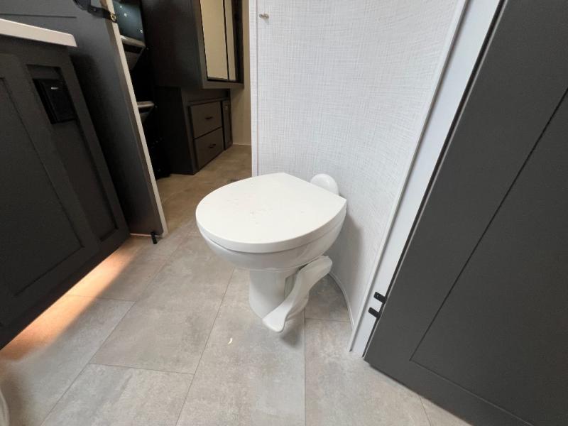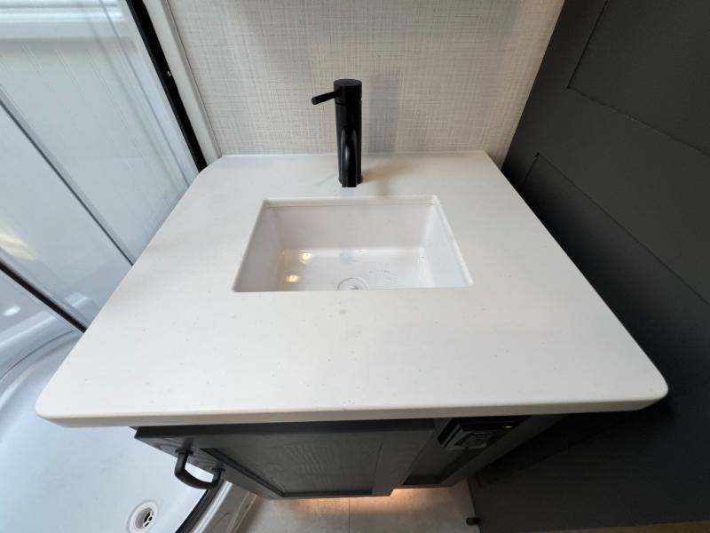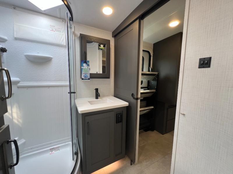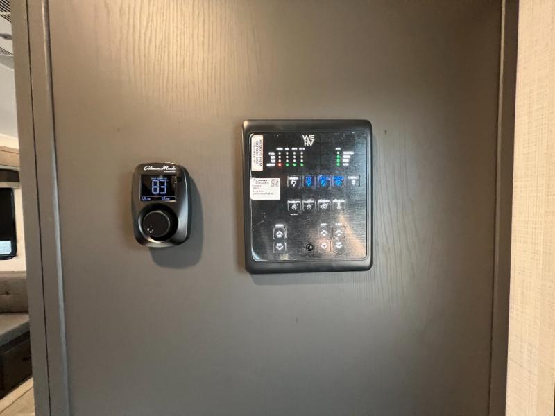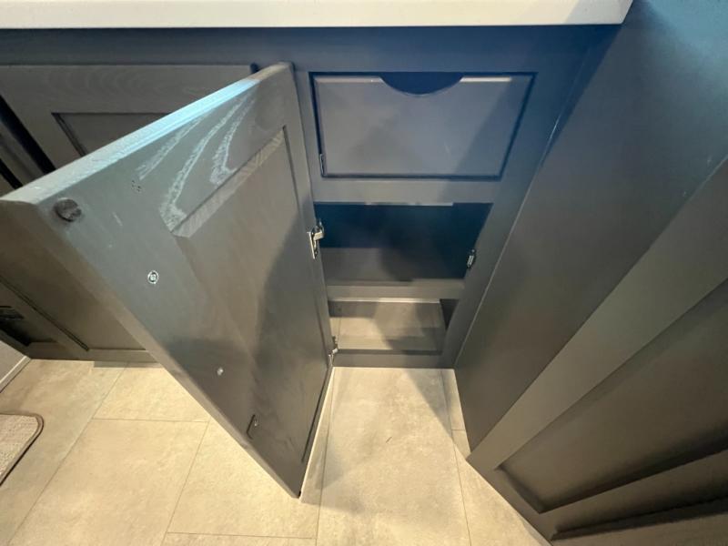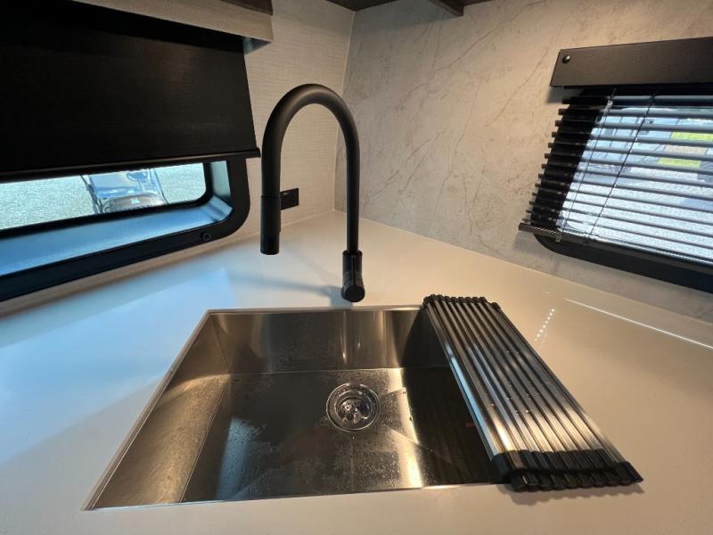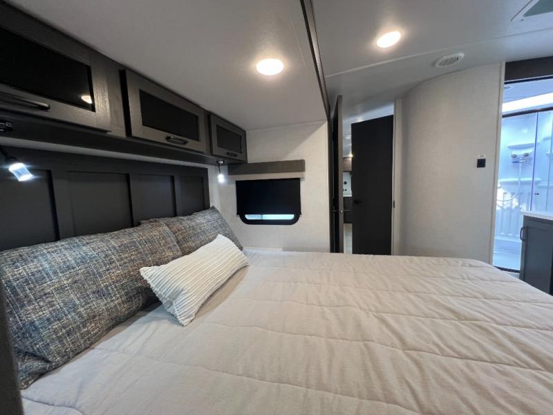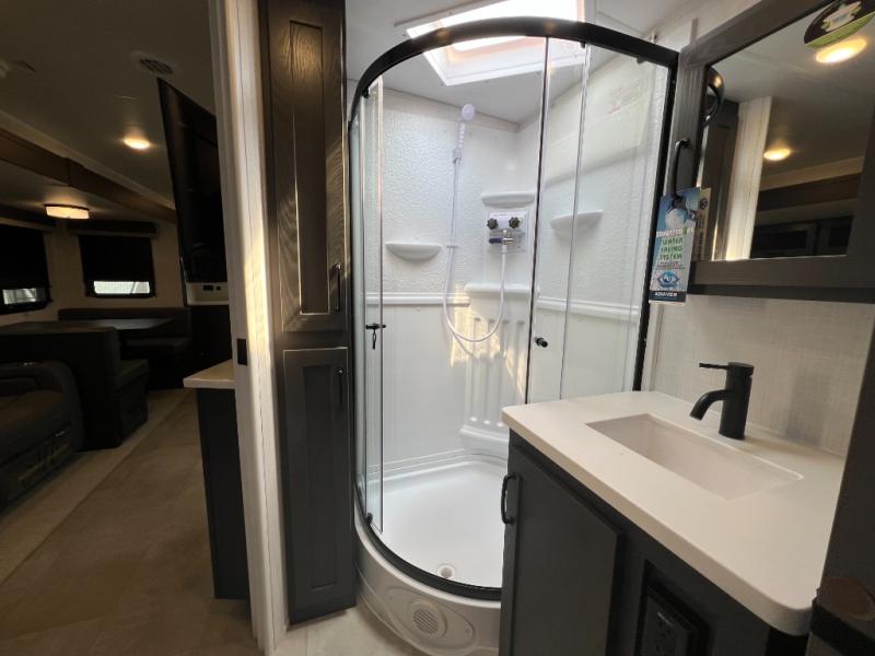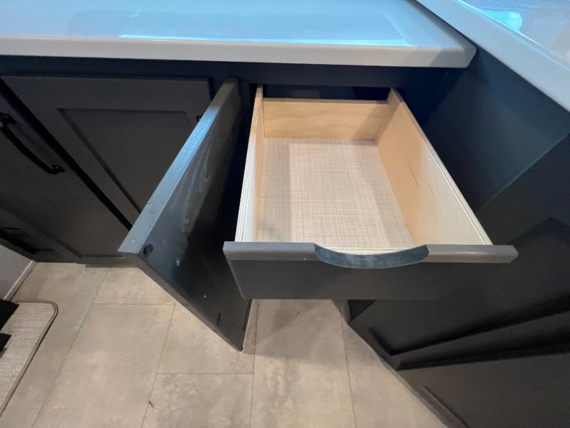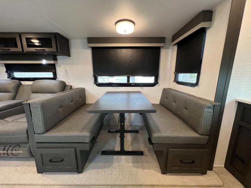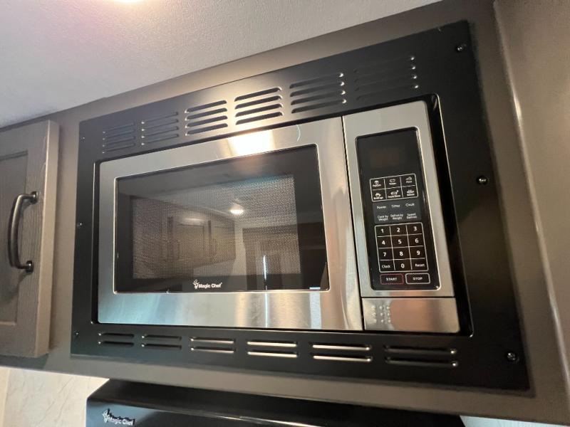 When you are outside this trailer you can enjoy the protection from the 21' power awning, and whip up a meal using the outside griddle. You will find exterior storage for your extra gear, and a ladder at the rear. You get to choose which entrance to step up into, be it the spacious rear bedroom with a queen bed slide and a wardrobe, or the main entry into the kitchen and living area. The furniture slide includes a booth dinette to eat your meals at, and theater seating to watch the Smart TV with a fireplace below. And the cook will love the front kitchen with extra counter space, a three burner range, plus a 12V refrigerator and pantry for food storage!