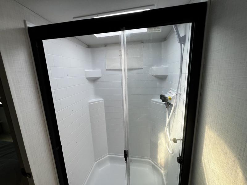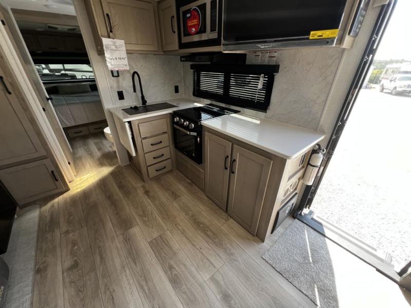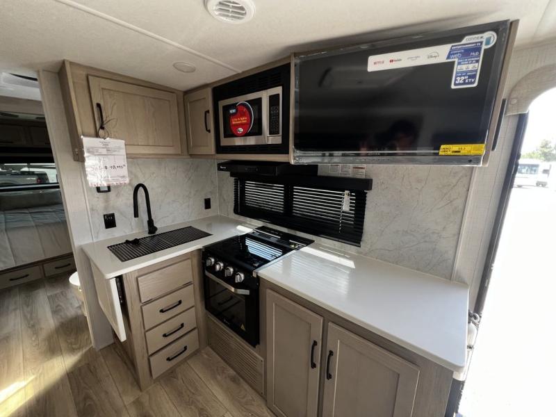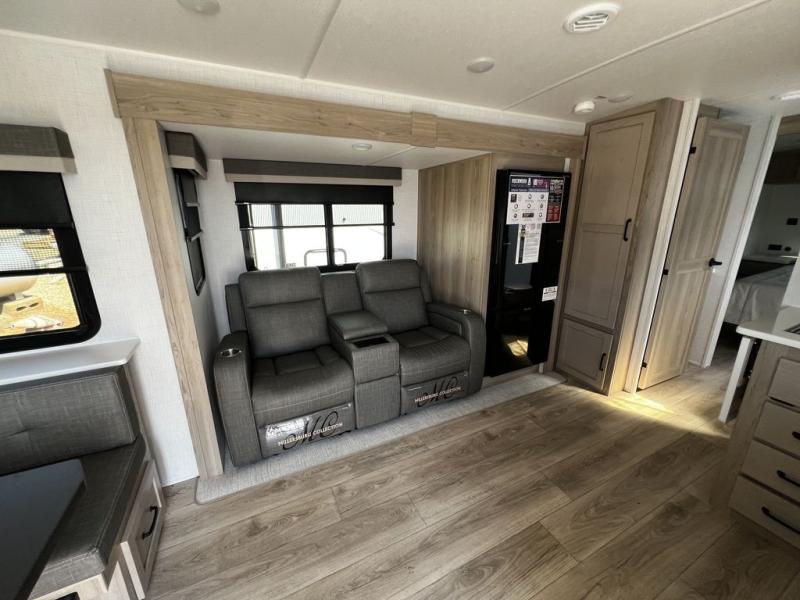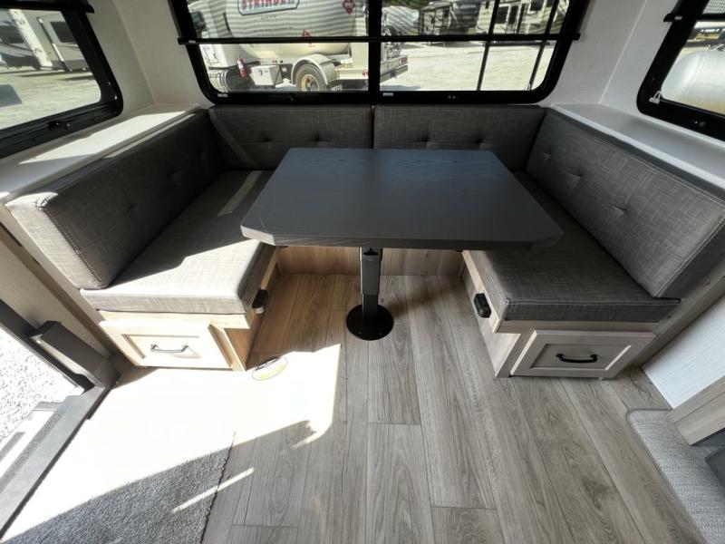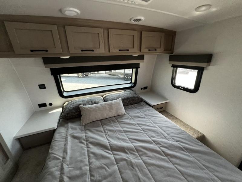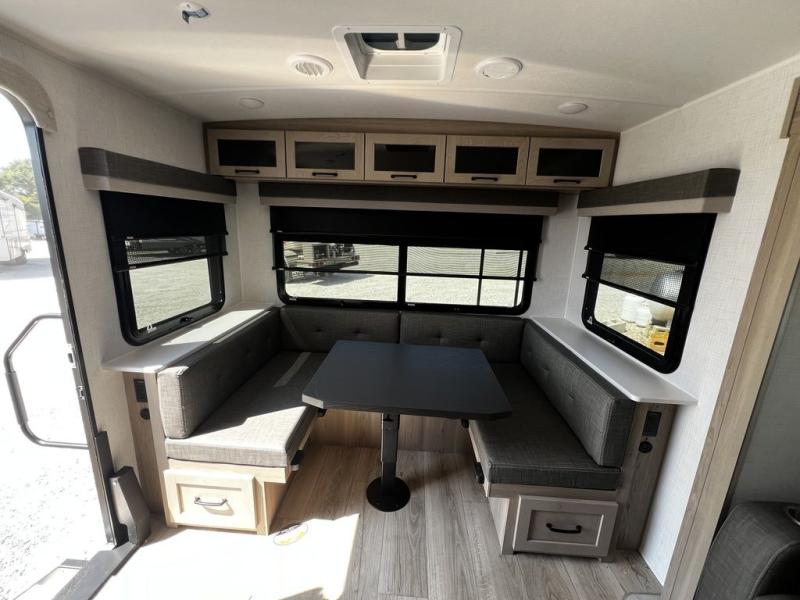 This double slide out travel trailer is perfect for weekend trips or extended stays! Your crew can play a game around the U-shaped dinette, relax on the theater seat across from the TV, or visit outdoors under the 21' awning. The fully-equipped kitchen allows you to make meals each day, and the walk-thru bath is easily accessible for everyone to use. This model also includes a front master bedroom with a queen bed, a wardrobe slide out, and one of the dual entry doors for convenience!