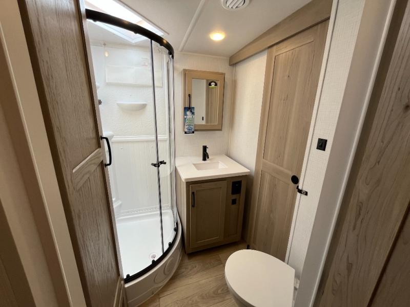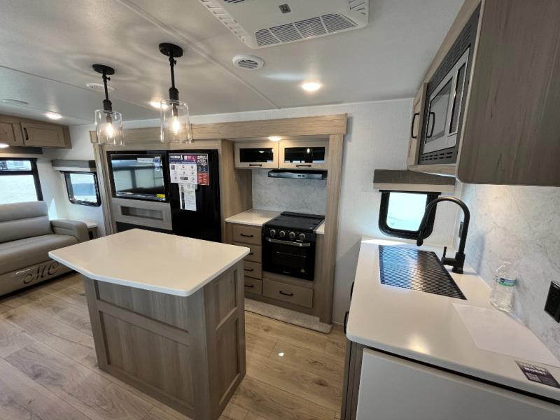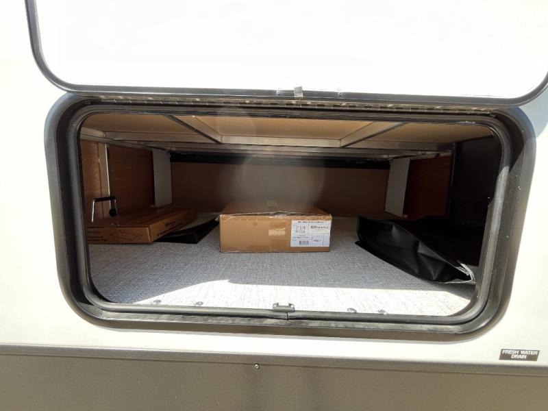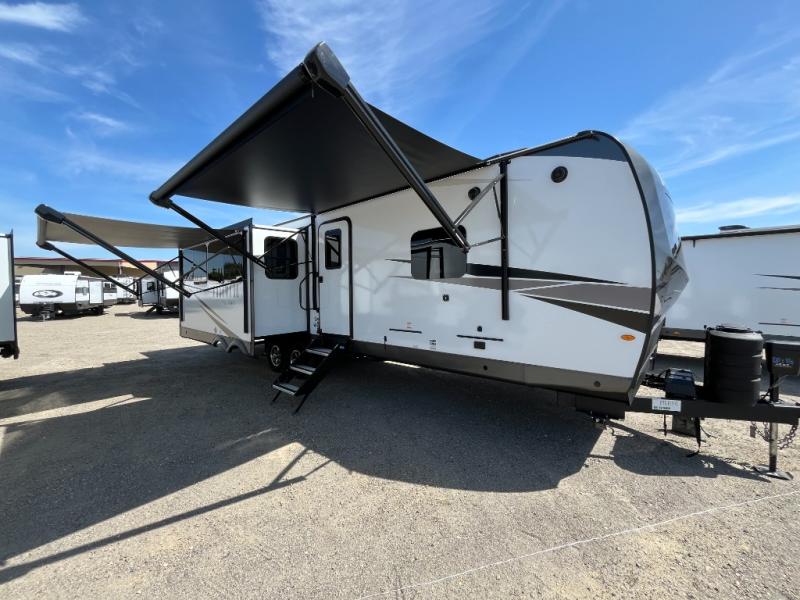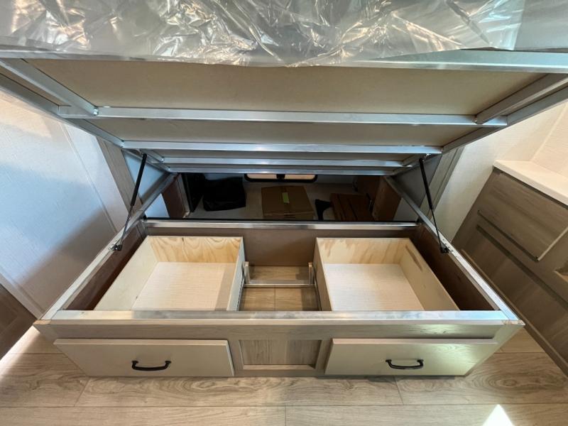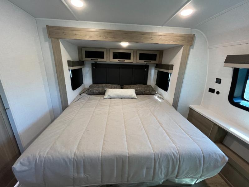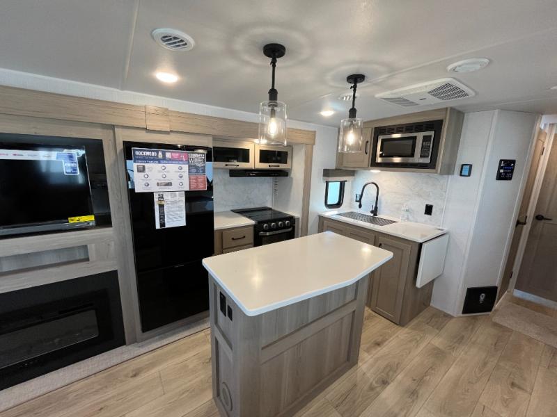 This trailer allows you to seat nine people, and the kitchen island provides a great place for the snacks and beverages. The dual opposing slides give the main living and kitchen area lots of floor space for everyone to move around, and the double entry bath is convenient with access from the hallway and the master suite. The front bedroom offers a queen bed slide, a wardrobe and storage along the front wall, plus you can choose to add an optional TV. And the two 11' power awnings give you an outdoor living area protected from the elements; just add your camping chairs.