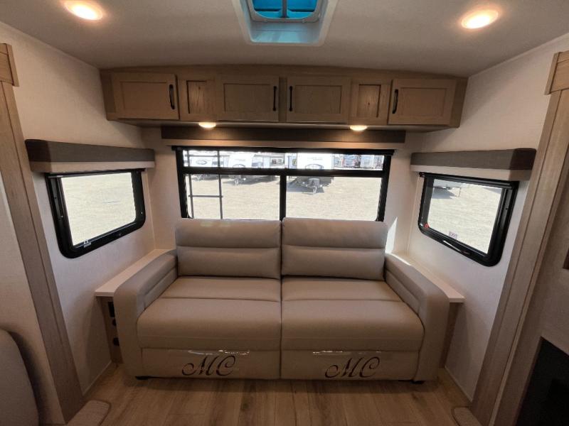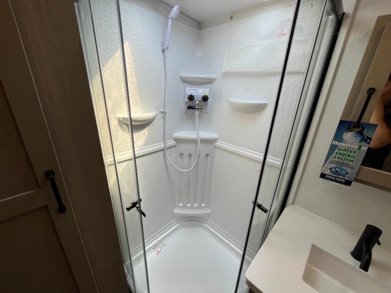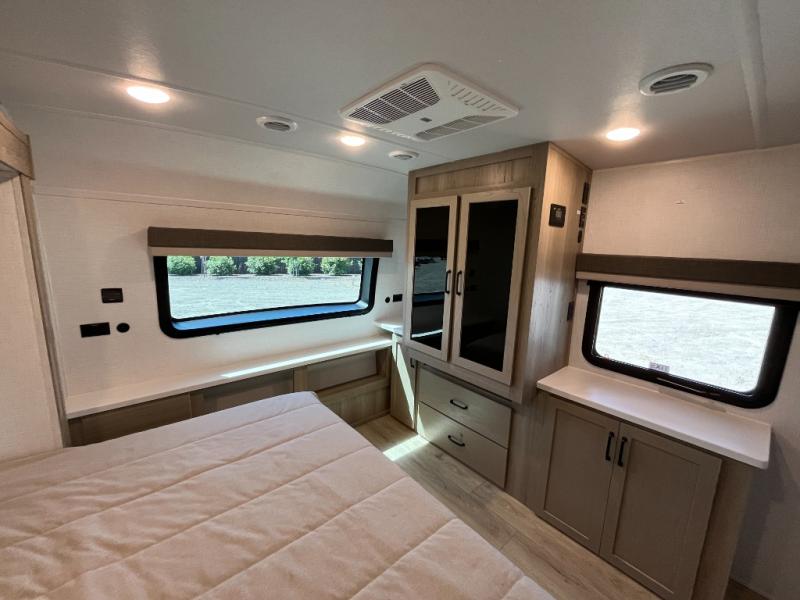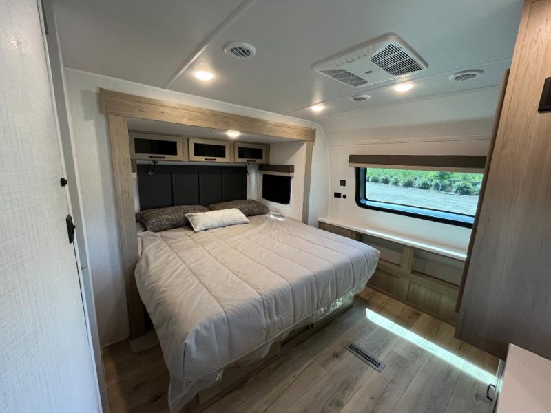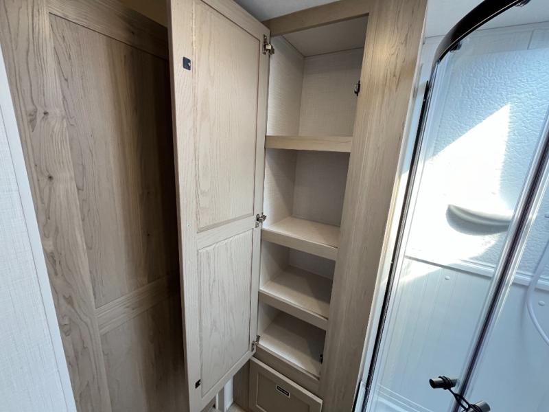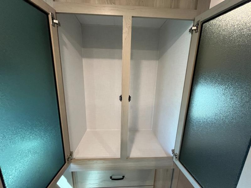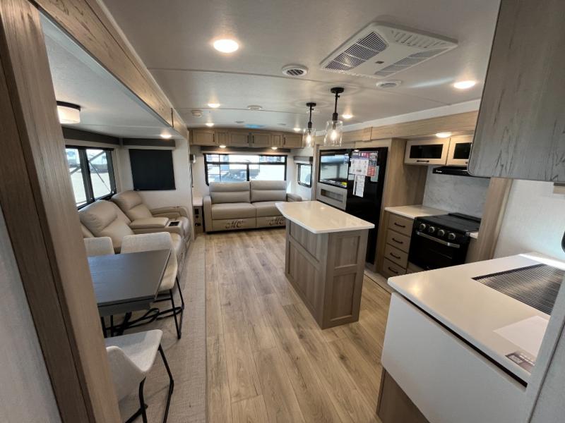This trailer allows you to seat nine people, and the kitchen island provides a great place for the snacks and beverages. The dual opposing slides give the main living and kitchen area lots of floor space for everyone to move around, and the double entry bath is convenient with access from the hallway and the master suite. The front bedroom offers a queen bed slide, a wardrobe and storage along the front wall, plus you can choose to add an optional TV. And the two 11' power awnings give you an outdoor living area protected from the elements; just add your camping chairs.
