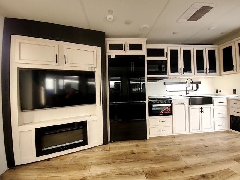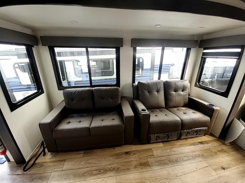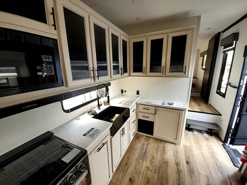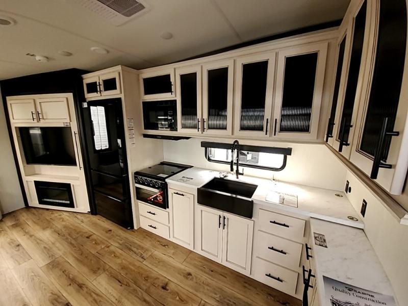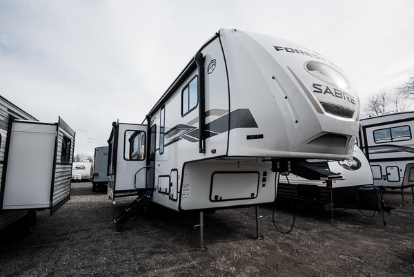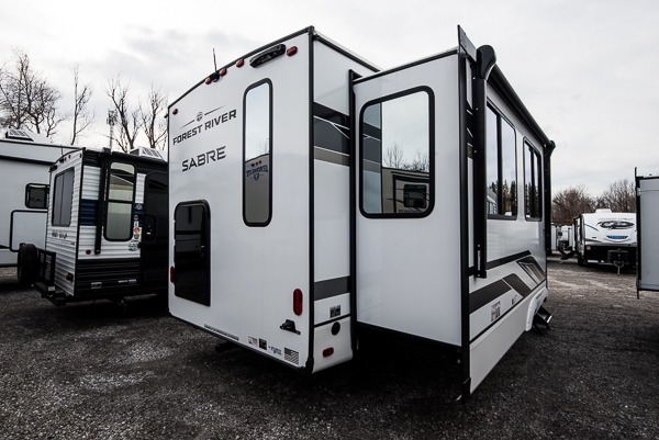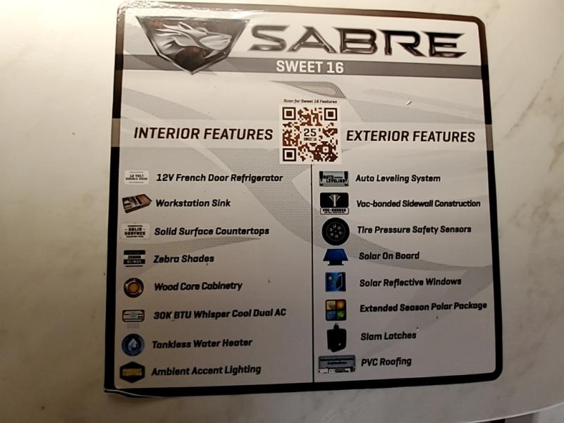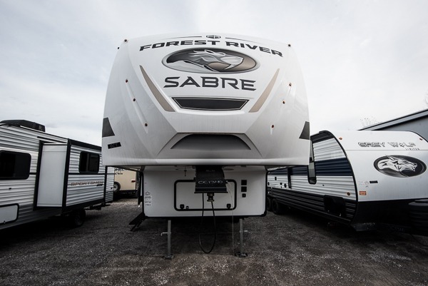 You will experience luxurious camping trips at an affordable price with any one of these Forest River Sabre fifth wheels! These models are durable and ready to travel anytime of the year thanks to features like the high-gloss gel-coat front cap with LED lighting, the PVC roof membrane, and the forced air underbelly with enclosed gate valves. The electric auto-leveling system makes setting up easy and safe, and the adjustable power awning with LED lighting will create an inviting outdoor living space. Each model includes a universal docking station which includes a black tank flush and an outside shower, and detachable and adjustable stable steps for you to enter and exit the unit safely. Inside, you will love the design of the ambient accent lighting in the living area, the real wood lumbercore cabinetry, and the linoleum flooring!
