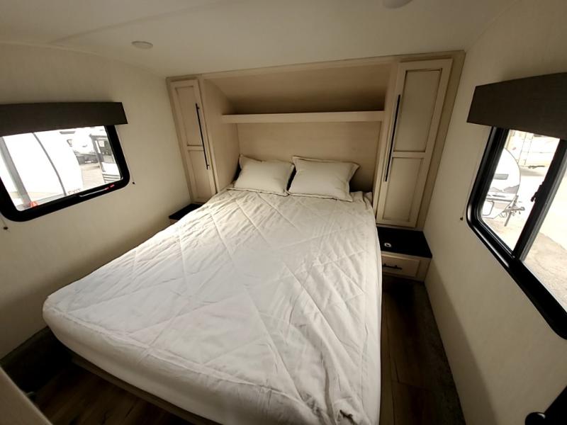 Time at the campground in this spacious travel trailer will be time well spent! The large slide out will provide your crew with plenty of space to stretch out, and there is a tri-fold sofa here and a theater seat for added comfort. There is also a collapsible dinette that you can take out when you're ready to eat. The swing-out entertainment center hides the walk-in pantry, and the colossal 12V refrigerator with French doors will be perfect for perishables. There is generous counter space in the fully-equipped kitchen, and the full bath includes a spacious shower with a seat so you won't feel crammed when getting ready for the day. Head to the front private bedroom where you'll get a great night's rest on the queen bed and be able to store your items in the dual wardrobes!