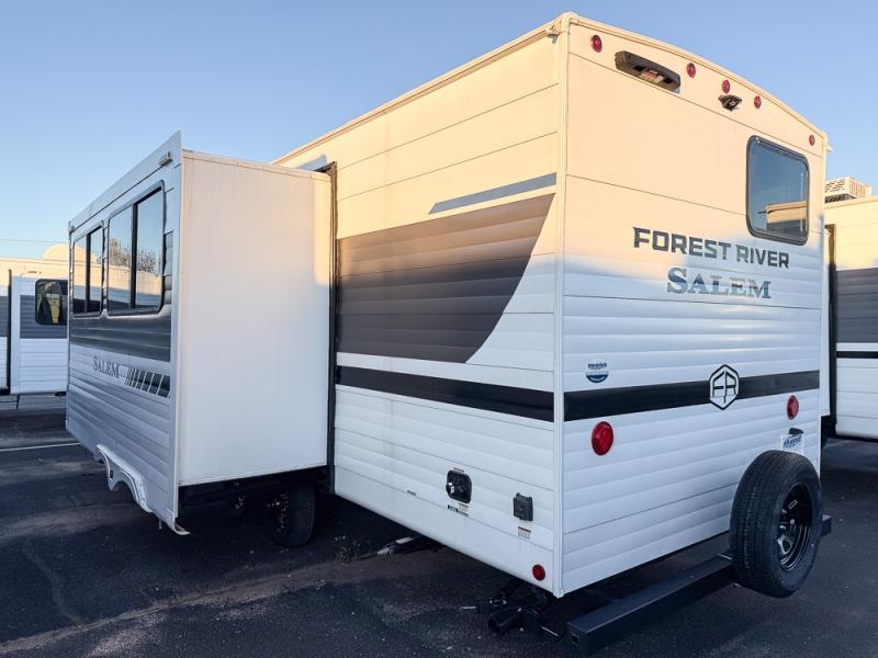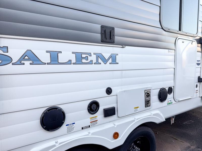 The Salem travel trailers are packed with hassle-free camping amenities! There are a variety of floorplans to choose from between three different regions. The heated and enclosed Accessibelly will help protect against the elements and debris during transport, and the exterior retro/metal redesign is sure to be eye-catching! There are stylish roller shades inside, along with updated backsplash, elegant curtain rods and curtains, plus many more interior comforts! Choose a Salem travel trailer today for quality and value!