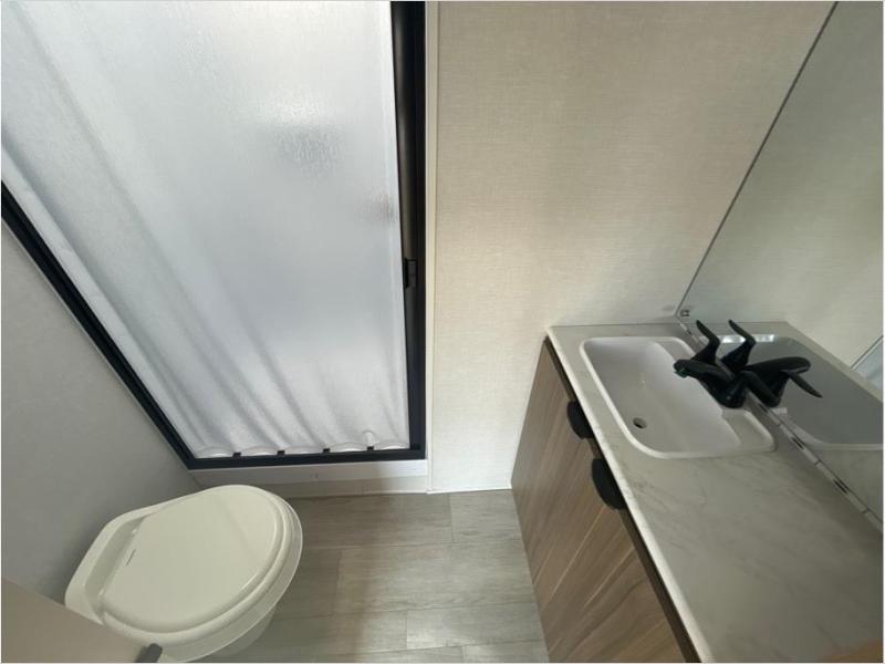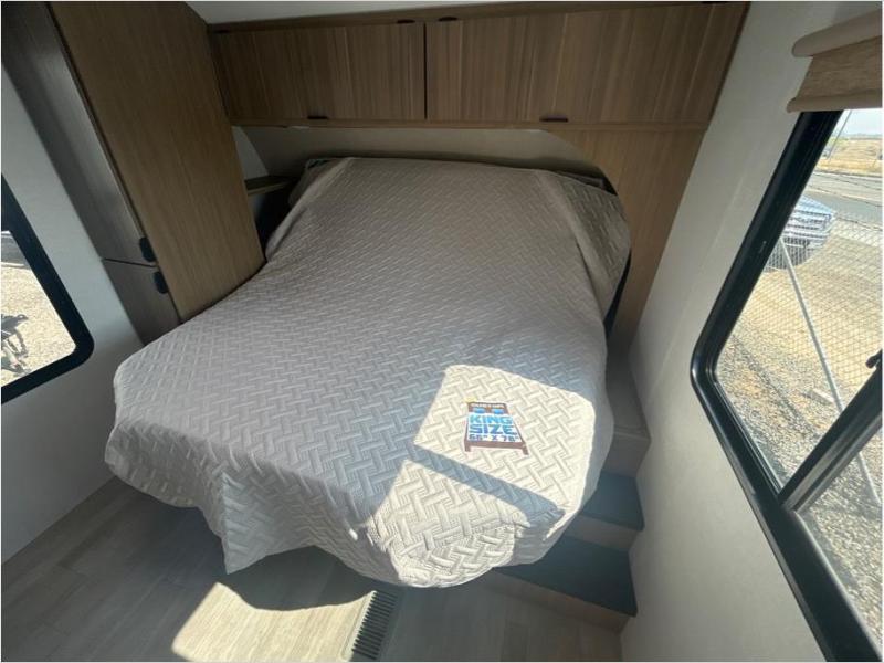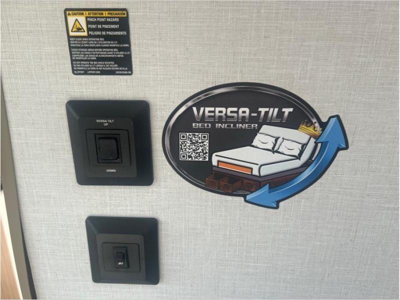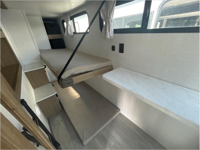Your family of four will enjoy this Salem View bunk model featuring 105 square feet of window space for unbelievable views of your surroundings. A Versa Slide features a refrigerator, pantry, and entertainment center with a door leading to a bunk space including a set of 30" x 70" bunks with top flip-up bunk, storage cubbies for your things, and a desk with bar stool for any office work that you may need to do while you travel. The rear kitchen area offers 18 linear feet of countertop space with four bar stools, plus a range and double sink. Your refrigerator and pantry will hold all of your perishables and dry goods, and those are nearby within the Versa slide. Up front, a private bedroom with Versa-Tilt custom king bed which provides additional floor space, plus you will find a wardrobe with washer and dryer prep option. A large pass-through storage compartment offers plenty of space for your outdoor gear, and if you enjoy outdoor cooking, you are sure to love the exterior camp kitchen!