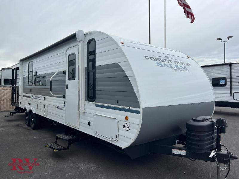 The Salem Cruise Lite travel trailers and toy haulers are value-minded units packed with great camping features! There are a variety of floorplans to choose from between three different regions. The enclosed Accessibelly will help protect against the elements and debris during transport, and the exterior retro/metal redesign is sure to be eye-catching! There are stylish roller shades inside, along with updated backsplash, elegant curtain rods and curtains, plus many more interior comforts! Choose a Salem Cruise Lite today for quality and value!