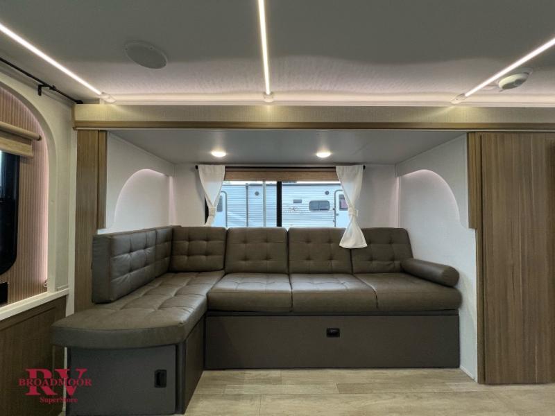 This travel trailer will feel more like home with its rear veranda/porch, dual entry doors, and front master bedroom! There is an outdoor kitchen on the back porch so you can make lunch in the fresh air, and the patio doors lead right into the main living area. Your crew can relax on the L-shaped sofa across from the fireplace, which will make your space more cozy. The U-shaped kitchen counter includes a pull-out table for even more counter space, and the walk-thru bath is easily accessible for everyone to use. You will love having your own space in the master bedroom, and the Versa-Tilt custom king bed will let you sit up in bed to read your book at night. One of the dual entry doors is also found here for added convenience!