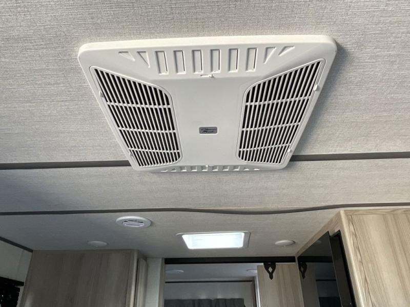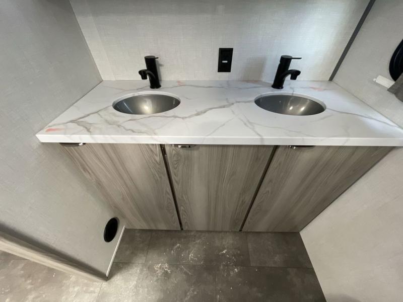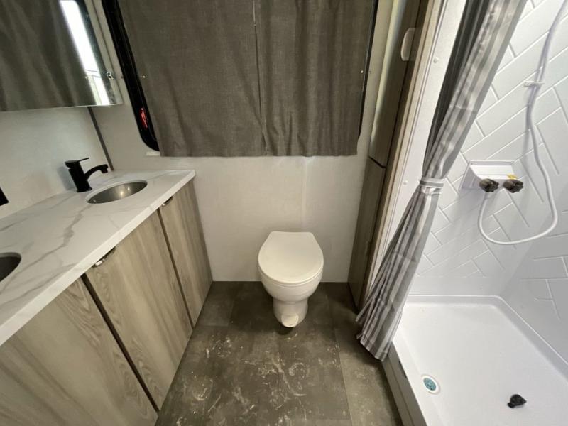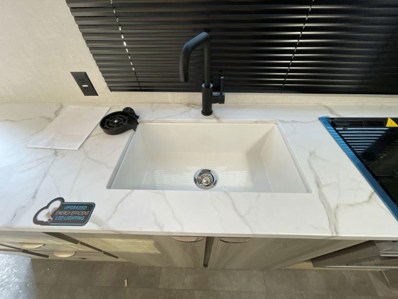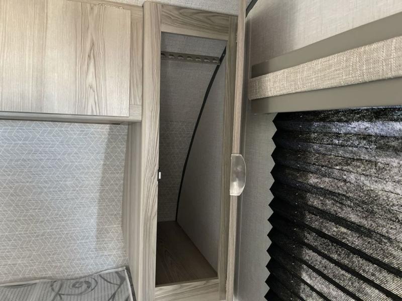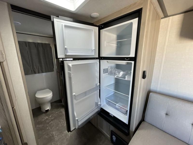 Camping is made easy in this travel trailer with at-home comforts! You'll have the front private bedroom with a king bed all to yourselves, and there are dual bedroom wardrobes to keep your space neat and clean. Any additional guests can sleep on the super lounge with a removable table. You will appreciate the full rear bath complete with a linen closet and dual bath sinks so you both can get ready for bed at once. And a full kitchen lets you whip up your best meals!