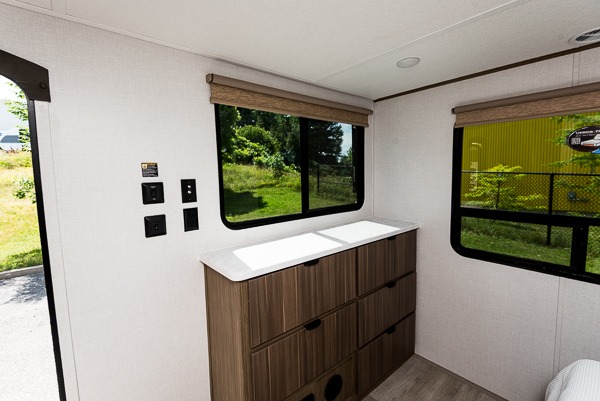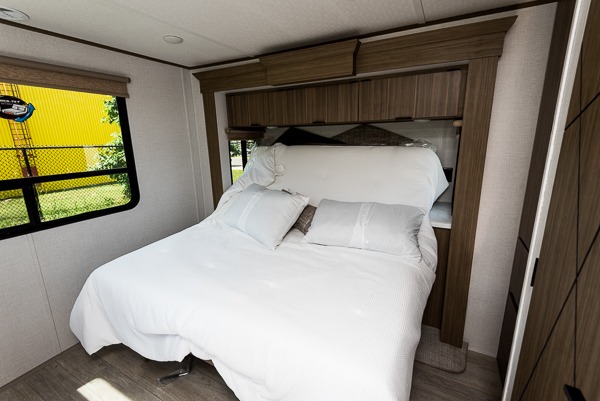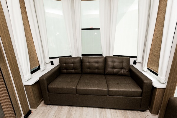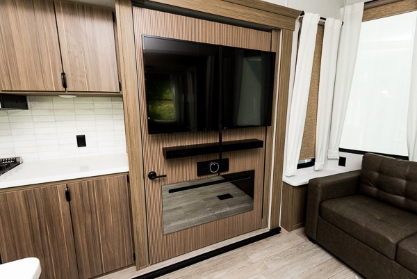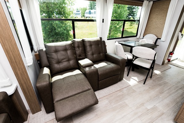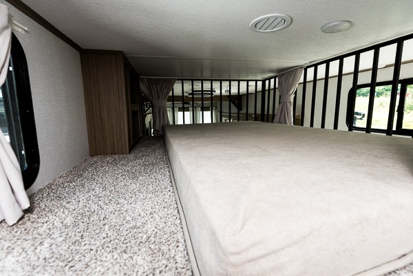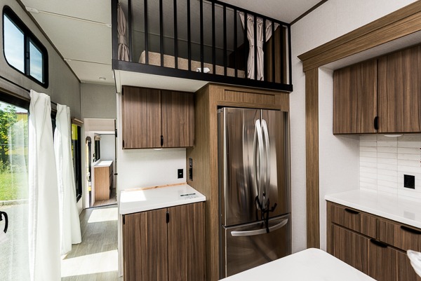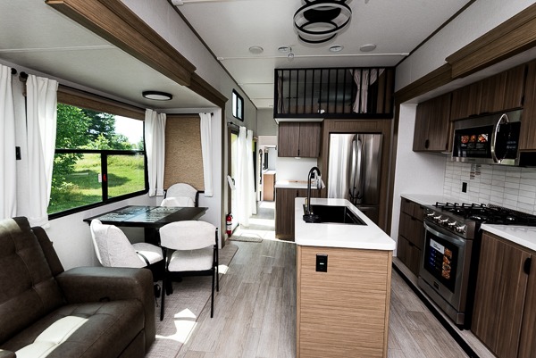 The grandkids will be begging to come along with you on your next getaway in this destination trailer! It features a double loft with three 42" x 74" bunk mats in total above the rear private bedroom. Inside the bedroom, you will find a king bed with Versa-Tilt slide and overhead cabinets, and a closet with optional washer/dryer prep if you want the option to go full-time. The walk-in shower with a seat will make it easy for everyone to stay fresh and clean as well. The living and kitchen area feature a kitchen island, a free standing dinette to enjoy meals and play games at, a front sofa, and theater seating across from the entertainment center with a fireplace for those crisp evenings!