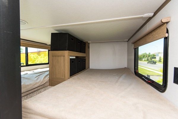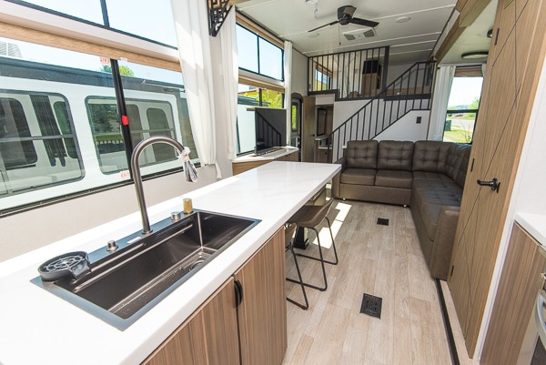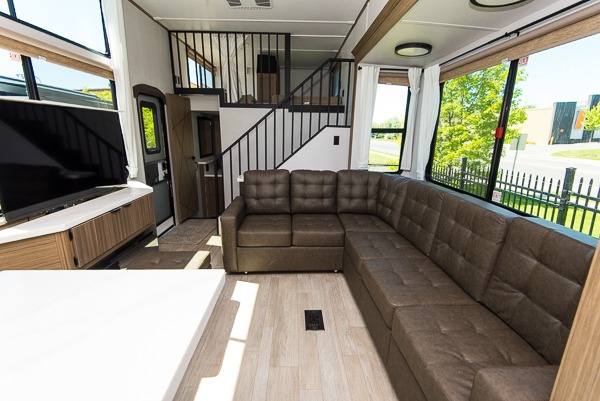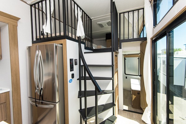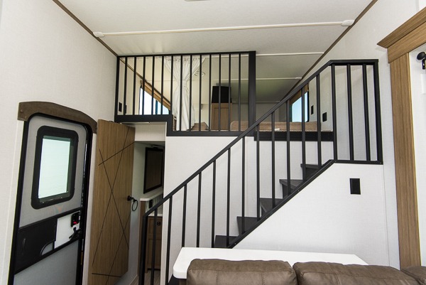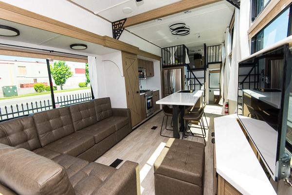 You will feel right at home in this destination trailer! It has not only has one loft in the rear with two 42" x 74" bunk mats, but also a second loft in the front with spiral steps leading up to two bunk mats. The front private bedroom features a king bed slide with Versa-Tilt to lay your head on at night with front windows to let in lots of natural lighting and sunshine in the morning. Relax in true comfort at night on the L-shaped sectional sofa across from the entertainment center with a fireplace. The kitchen island provides extra space to prepare delicious meals and comes with four bar stools to enjoy your breakfast each morning. Everyone will stay fresh and clean with a walk-in shower in the rear private bedroom, plus there is washer and dryer prep if you choose to add those appliances. Head outside through either the patio door or the second entry/exit door each day!