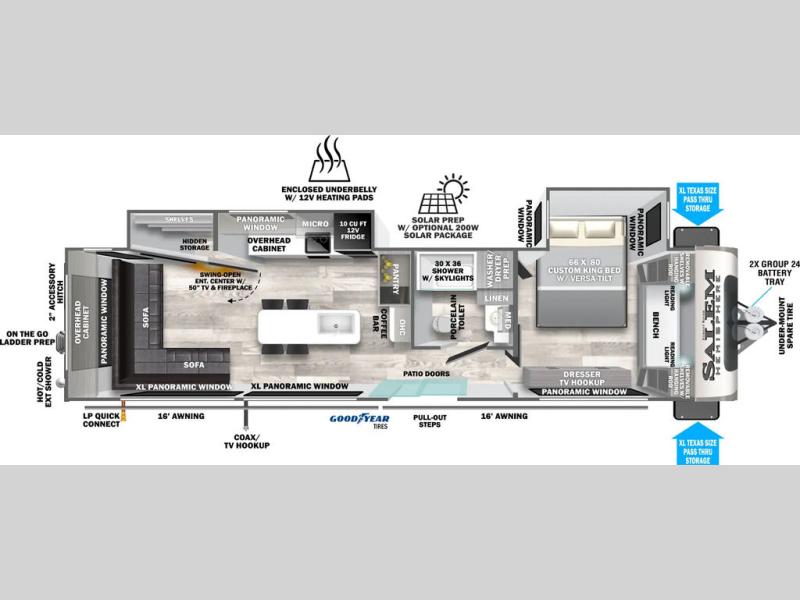The Salem Hemisphere fifth wheels and travel trailers by Forest River are packed with features, while still being value-minded! Each model is constructed with laminated "Aluma Frame" sidewalls and floor with block foam insulation plus full length barreled ceilings for added head space. There are LED awning, marker and tail lights outside, along with an extra large pass-thru storage with slam latch baggage doors, plus solar prep and Lippert On-The-Go ladder prep. The 60K on-demand tankless water heater will provide endless hot showers, and the JBL sound system includes a head unit plus interior and exterior speakers to keep the party going. There are also many interior comforts found throughout that will make you feel right at home!
