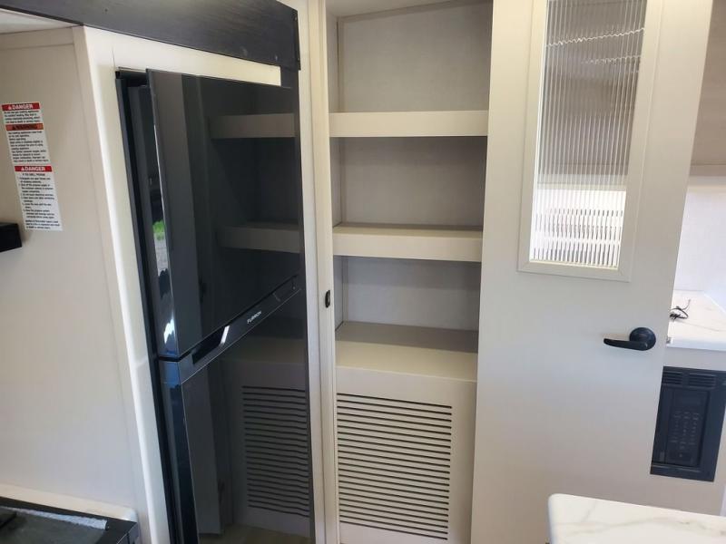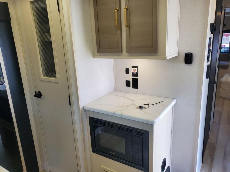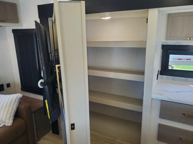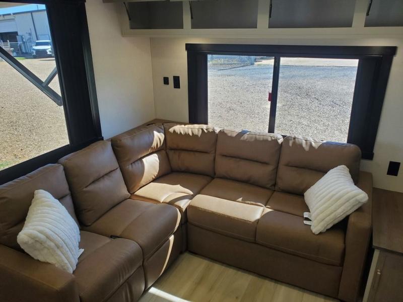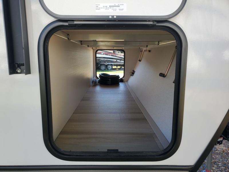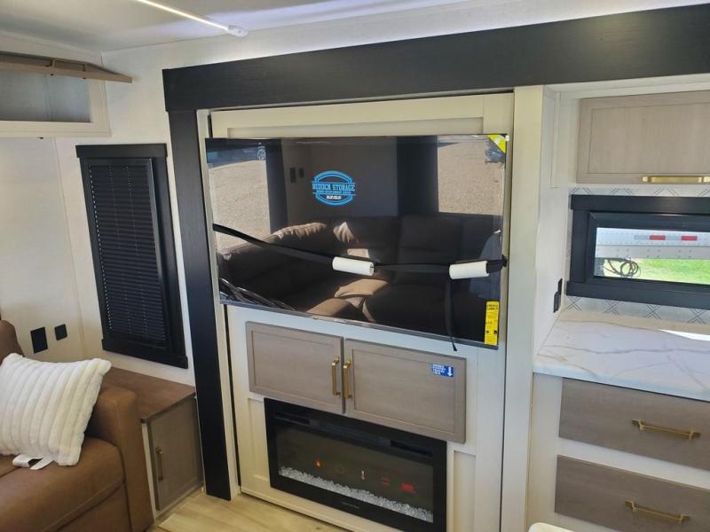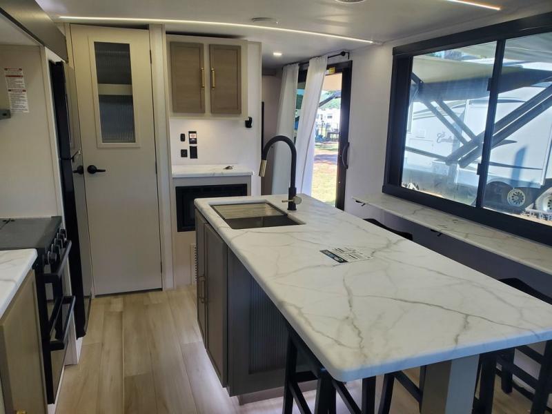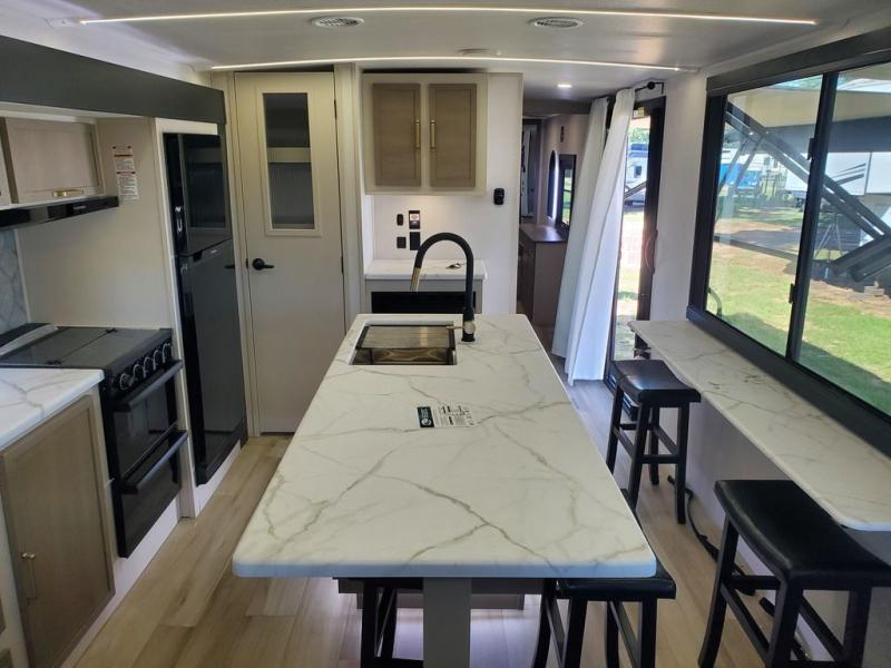 You won't get over how feature-packed this travel trailer is! Starting in the rear living area, you'll enjoy the spacious L-shaped sofa with panoramic windows for great outdoor views. There is a swing-open entertainment center with a 50" TV and fireplace, and behind that is hidden storage with shelves for movies, throw blankets, and more! When you're needing a place to dine at, the kitchen island with four bar stools will meet your needs perfectly. The chef of your group will also love the kitchen pantry, three burner cooktop, and 10 cu. ft. 12V refrigerator to keep food fresh. Everyone can take turns freshening up in the spacious full bath that includes a porcelain toilet, linen closet, and a shower with skylights for extra natural light. This model also includes a front private bedroom you are sure to love with its custom king bed slide out, a dresser with TV hookup, and a front bench with reading lights and removable shelves with a hanging rod for your clothes. There is even a closet with washer/dryer prep if you plan to go full-time. And we haven't even touched on the exterior amenities, like the two 16' patio awnings with LED lights, hot/cold shower, 2" accessory hitch, and much more!