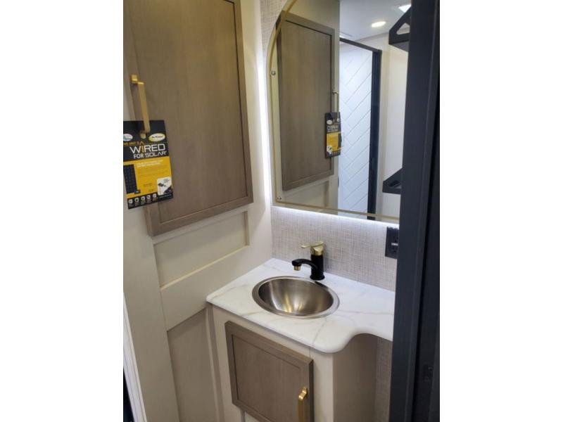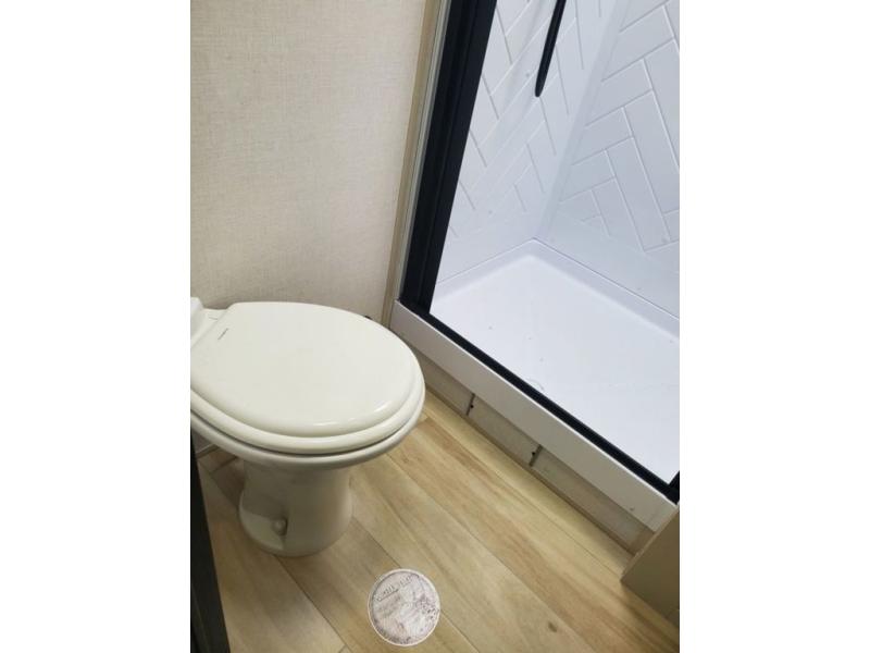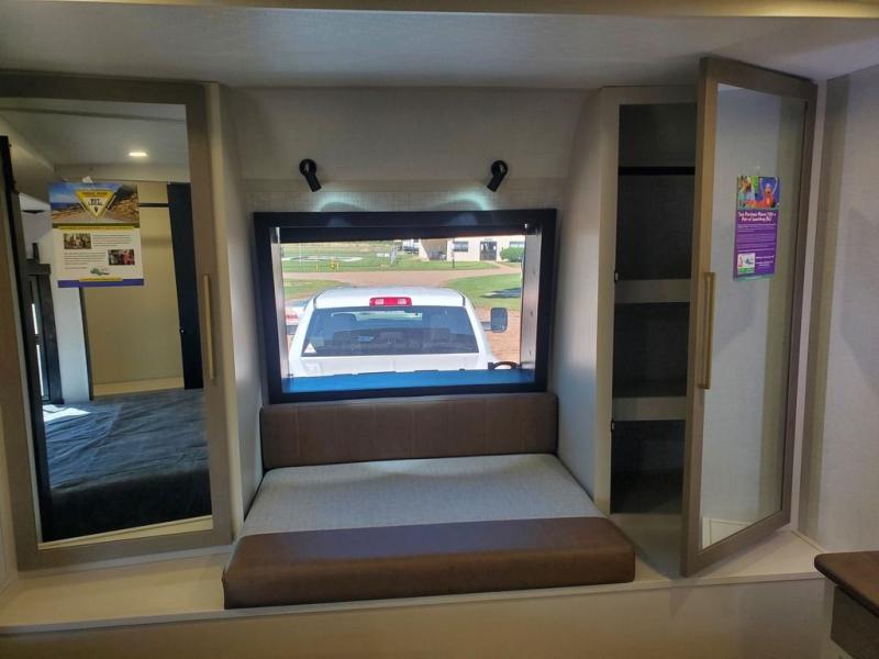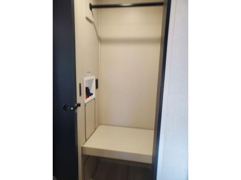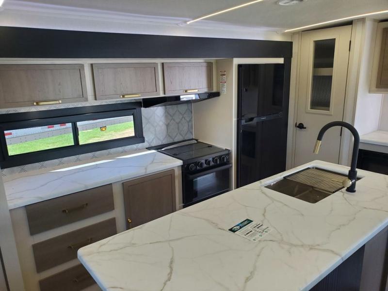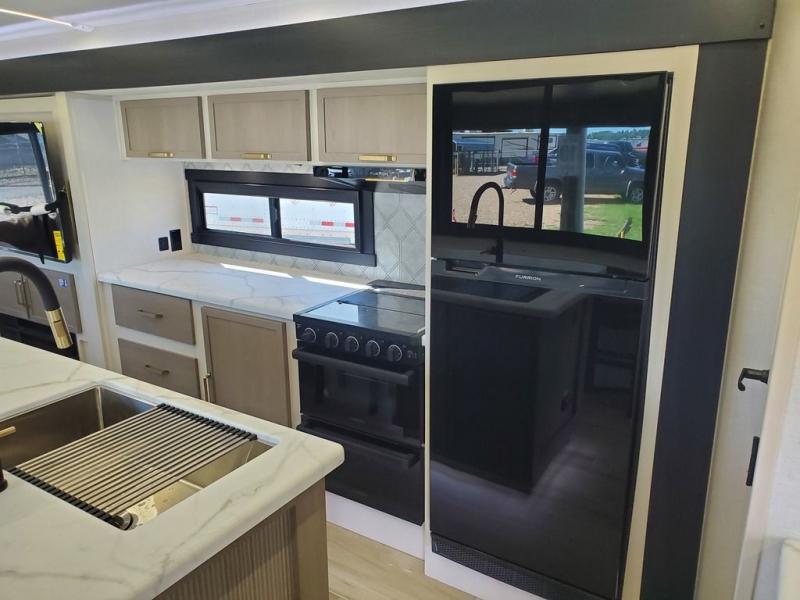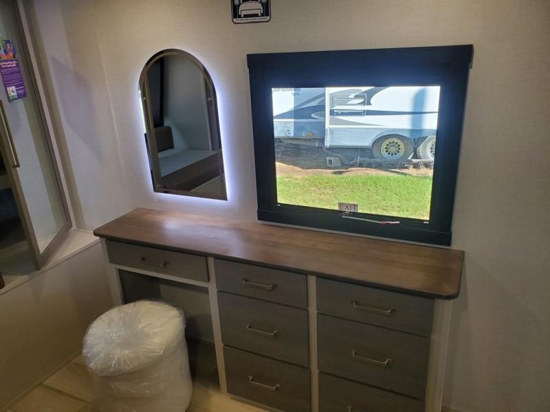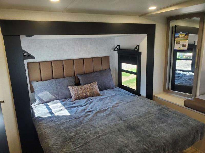 You won't get over how feature-packed this travel trailer is! Starting in the rear living area, you'll enjoy the spacious L-shaped sofa with panoramic windows for great outdoor views. There is a swing-open entertainment center with a 50" TV and fireplace, and behind that is hidden storage with shelves for movies, throw blankets, and more! When you're needing a place to dine at, the kitchen island with four bar stools will meet your needs perfectly. The chef of your group will also love the kitchen pantry, three burner cooktop, and 10 cu. ft. 12V refrigerator to keep food fresh. Everyone can take turns freshening up in the spacious full bath that includes a porcelain toilet, linen closet, and a shower with skylights for extra natural light. This model also includes a front private bedroom you are sure to love with its custom king bed slide out, a dresser with TV hookup, and a front bench with reading lights and removable shelves with a hanging rod for your clothes. There is even a closet with washer/dryer prep if you plan to go full-time. And we haven't even touched on the exterior amenities, like the two 16' patio awnings with LED lights, hot/cold shower, 2" accessory hitch, and much more!