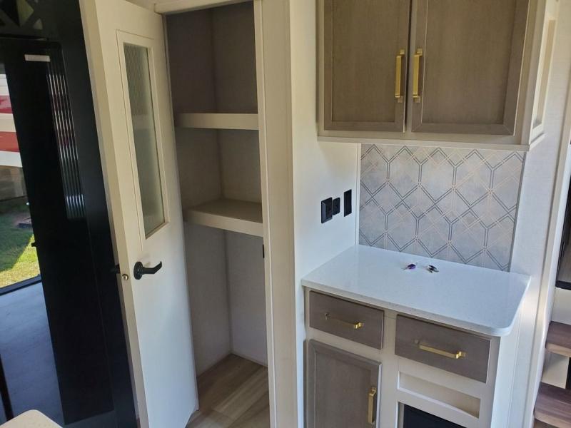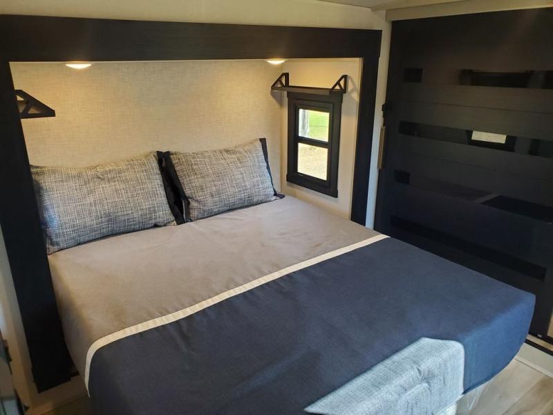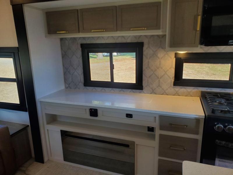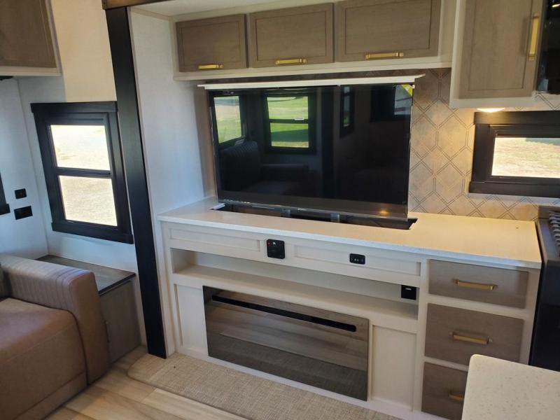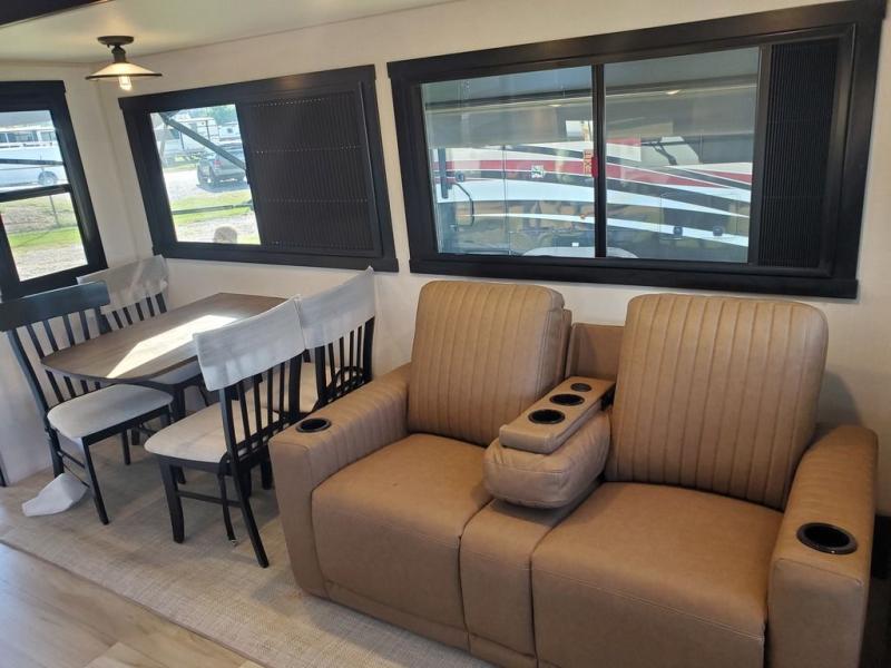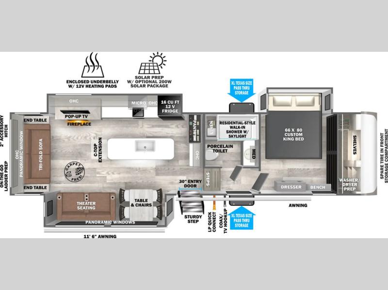 Each camping trip in this fifth wheel will be spent in comfort thanks to the spacious living areas and added amenities. Once you arrive at your favorite campground, you can set up the two awnings, grab your camp chairs from the XL Texas-size pass-through, and relax with a cold drink. If you'd rather kick your feet up inside, the theater seating across from the pop-up TV and fireplace will also bring lots of comfort! A rear tri-fold sofa will allow you to invite two overnight guests along, and the table and chairs provide a place to dine at each morning. You'll feel right at home with a spacious bathroom that includes a residential-style walk-in shower with a skylight, and a front private bedroom. There is a custom king bed with Versa-Tilt here, along with a dresser with a bench beside it, and a walk-in closet with shelves and washer/dryer prep if you plan to go full-time!