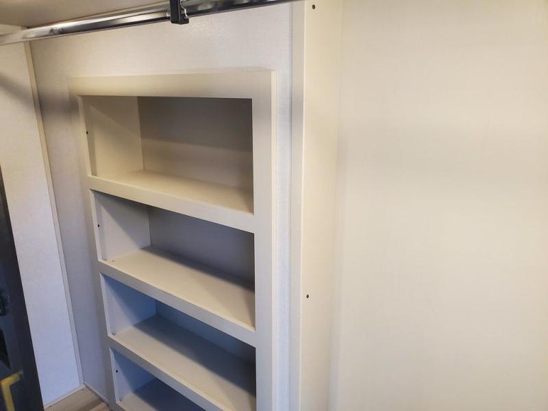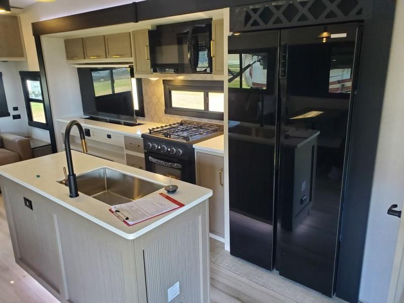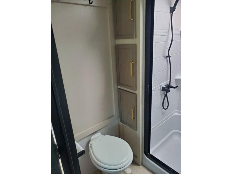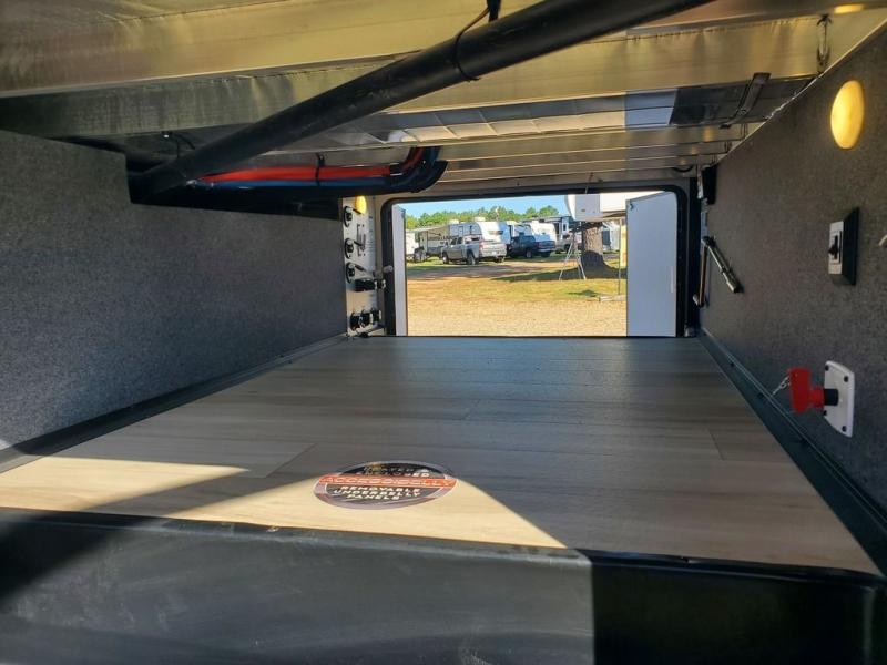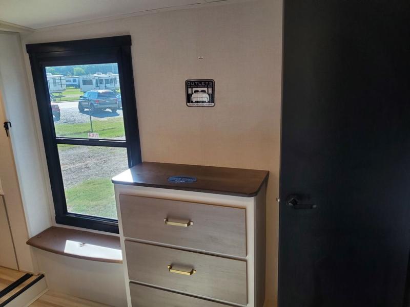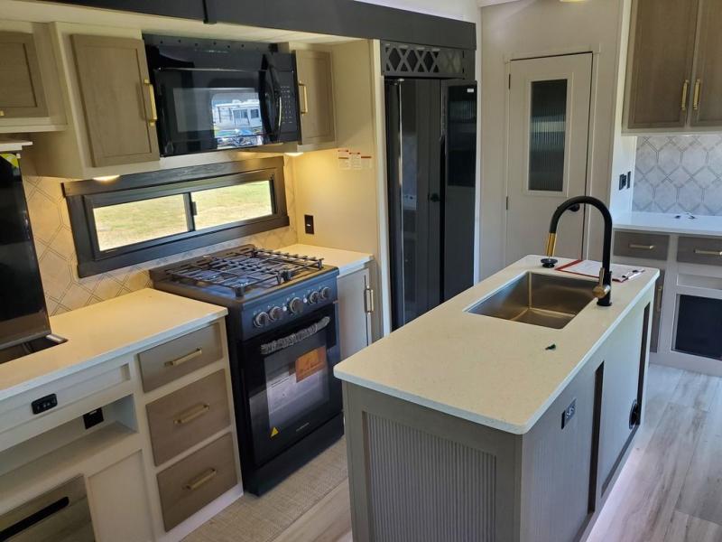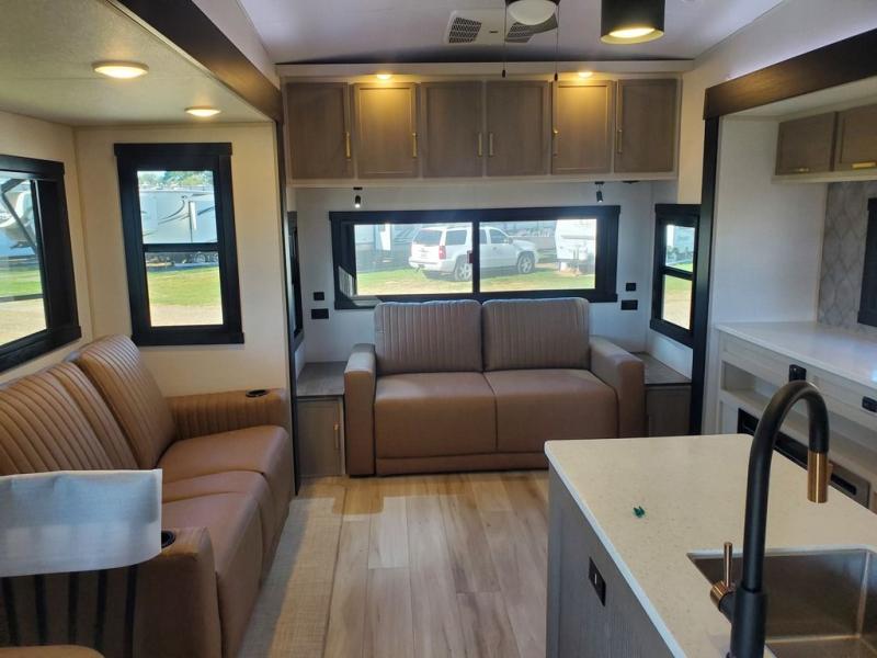 Each camping trip in this fifth wheel will be spent in comfort thanks to the spacious living areas and added amenities. Once you arrive at your favorite campground, you can set up the two awnings, grab your camp chairs from the XL Texas-size pass-through, and relax with a cold drink. If you'd rather kick your feet up inside, the theater seating across from the pop-up TV and fireplace will also bring lots of comfort! A rear tri-fold sofa will allow you to invite two overnight guests along, and the table and chairs provide a place to dine at each morning. You'll feel right at home with a spacious bathroom that includes a residential-style walk-in shower with a skylight, and a front private bedroom. There is a custom king bed with Versa-Tilt here, along with a dresser with a bench beside it, and a walk-in closet with shelves and washer/dryer prep if you plan to go full-time!