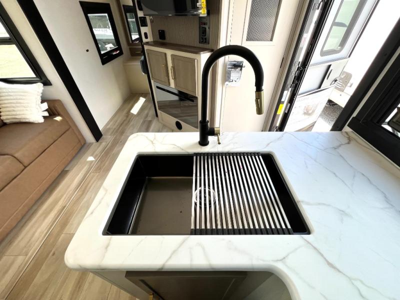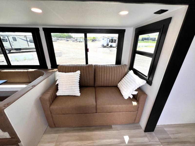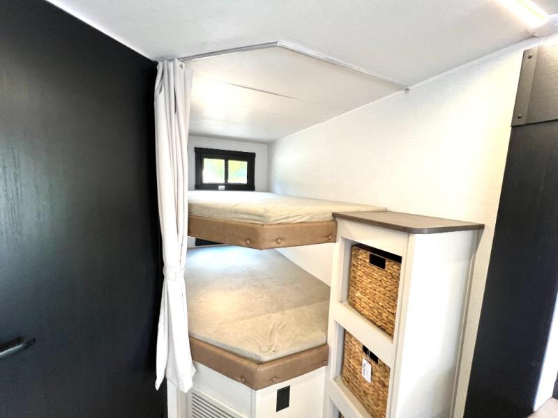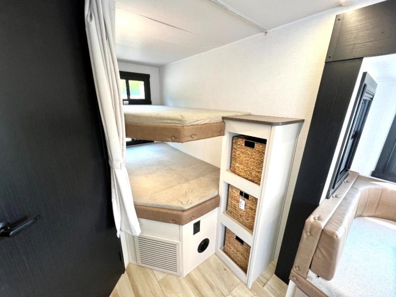 The whole gang will love camping in this bunkhouse model! Since the double-size bunks are right beside the full bath, the little ones can easily use it at night, plus you'll find the second entry door here for added convenience! The combined kitchen and living area includes a U-shaped dinette and tri-fold sofa in great view of the entertainment center with a TV and fireplace. A front private bedroom will provide you with your own space at night, and you're sure to sleep great on the queen bed with Versa Tilt. Head outdoors to enjoy the 20' awning with LED lights and the camp kitchen!