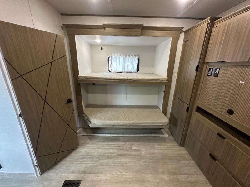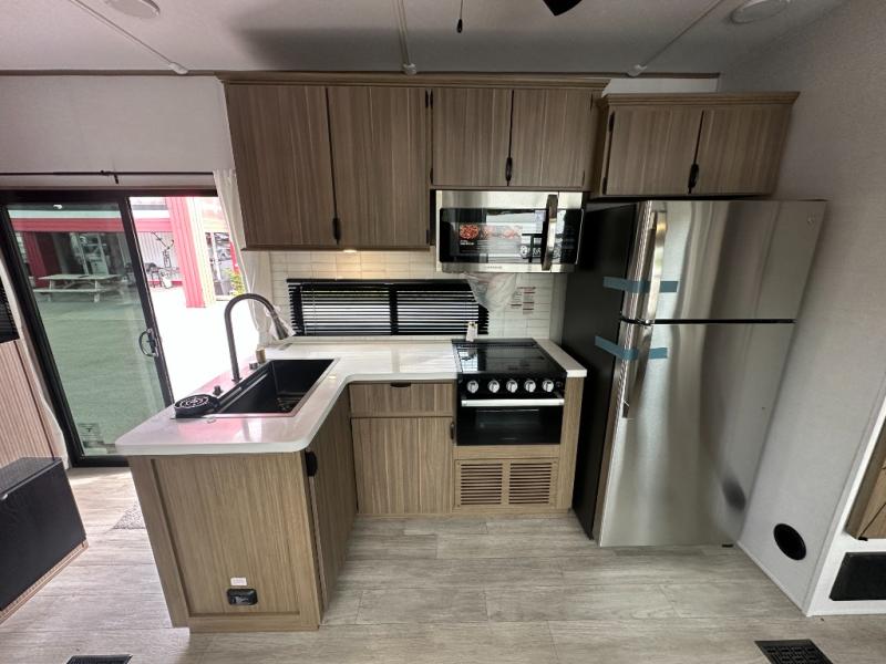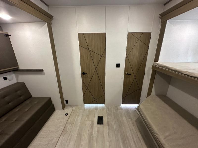 Spend your weekends sleeping on your own queen-size bed in the private bedroom while your guests or children spend their time in their very own bunkhouse suite that has opposing bunk bed slides and its own half bathroom with a private exterior entry door. The kitchen provides the necessary amenities such as a burner stove, a 1.6 cu. ft. oversized residential microwave, and a double-basin undermount sink. The residential refrigerator will store all your leftovers as well. You can dine and play games. On top of all of that, you will also be able to unwind in front of a cozy fireplace each night before you head to bed and drift off dreaming of the new day of adventure coming!