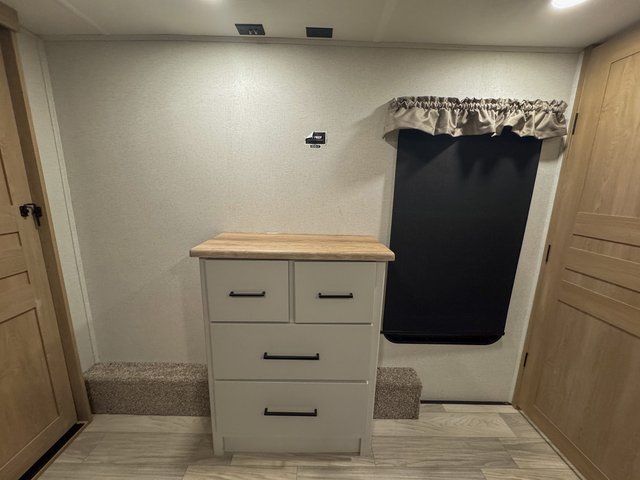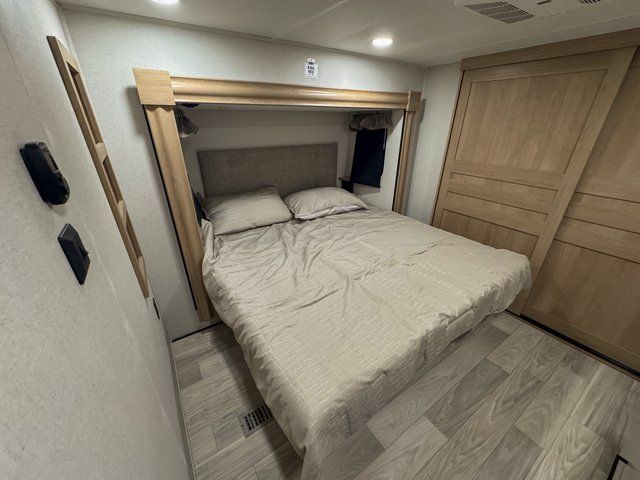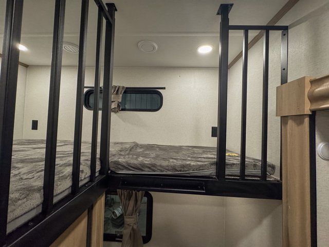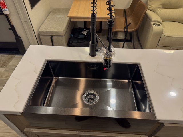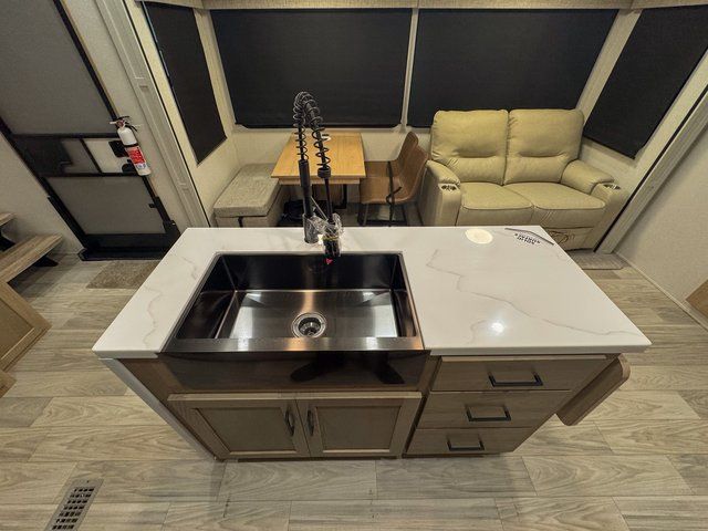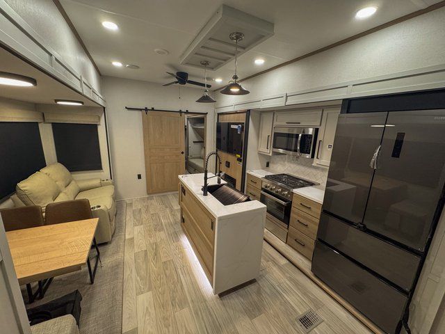 You and your family will love this one! Embrace yourself for a relaxing trip for everyone thanks to the multiple spaces to take a nap on the road. Starting with the king size bed on the main bedroom, perfect for you and your partner, next we have the bunk beds ideal for the kids and there is also a hide-a-bed sofa where an extra person can easily fit for a nap. Moving to the kitchen area, enjoy the experience of a home cooking the greatest meals with the three cooktop burner, and microwave. Keep your food fresh with the 12V refrigerator and perform multiple kitchen tasks on the incredible Kitchen Island. Have a relaxing moment in the living room seated on the comfortable theater seating. Last but not least, enjoy a refreshing bath after a long trip in the full bathroom.