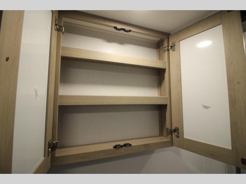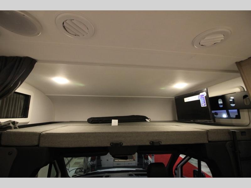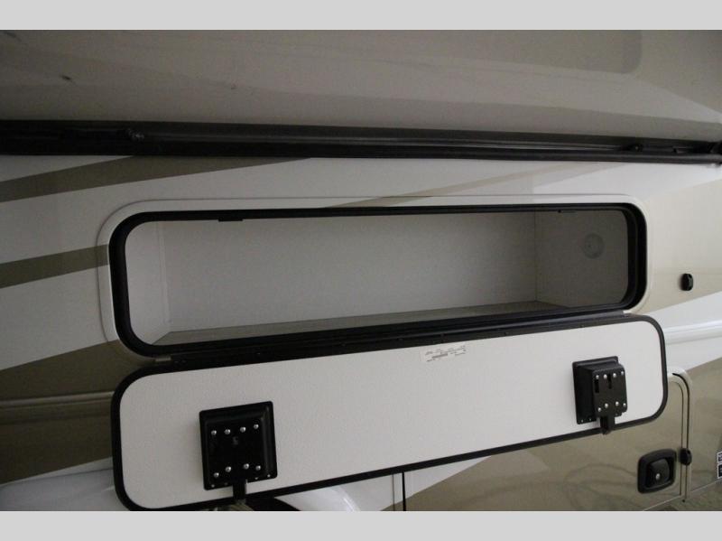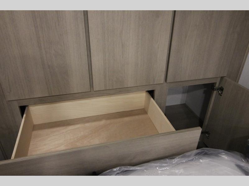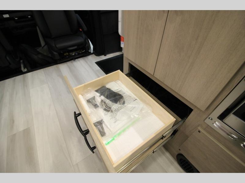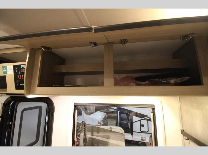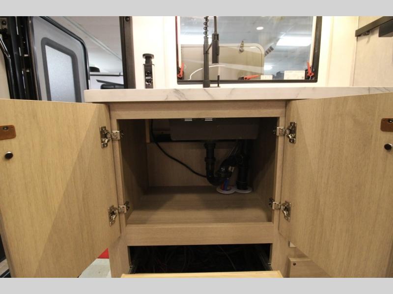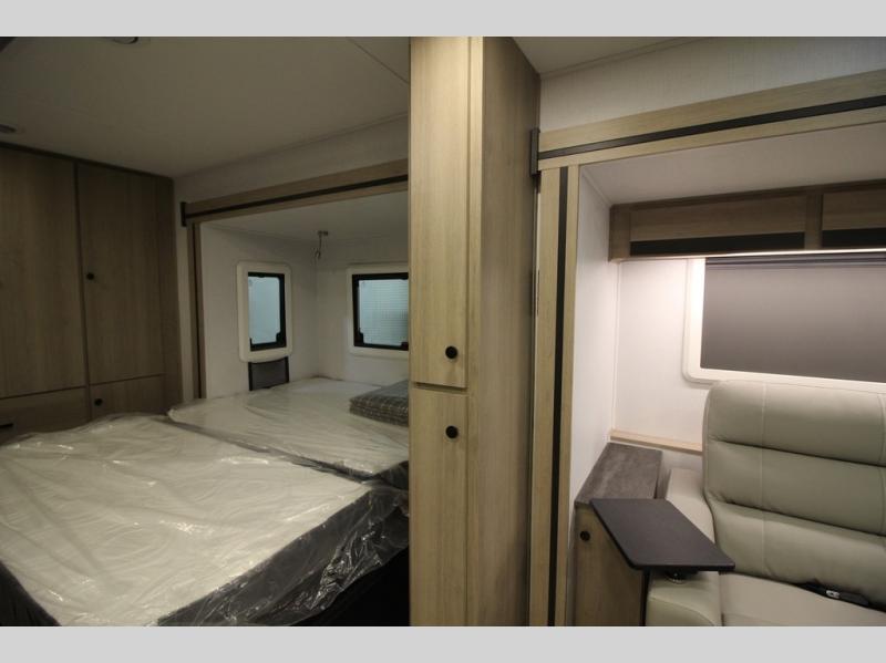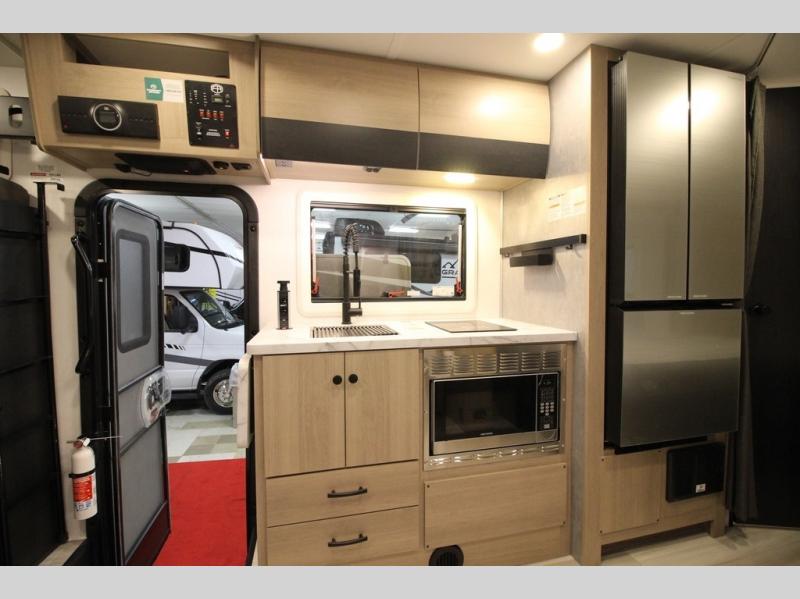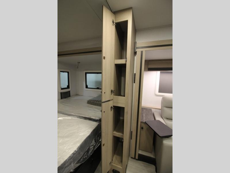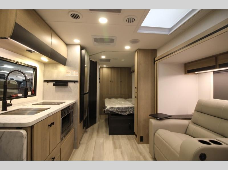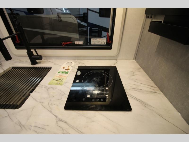 Everything you need is found in this cozy motorhome for five to six people. The swivel captain's seats can become a part of the living area once you park, and your guests can gather around the U-shaped dinette slide for game night. Your meals can be prepared each day on the induction cooktop with a convection microwave, and the flip-up counter will provide more prep space. There is also a 10.7 cu. ft. 12V refrigerator for food storage. The bedroom features a queen bed slide, 12V TV, plus a wardrobe to keep your clothes organized. A 60" x 80" cab-over bunk provides more sleeping space, or you can choose the optional Trekker cap with a built-in entertainment center!