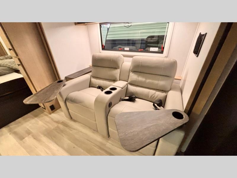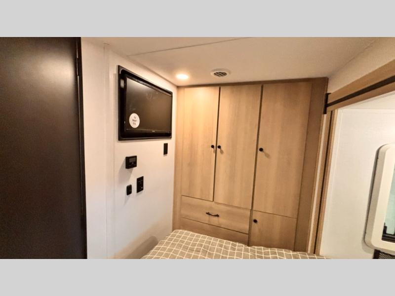 Everything you need is found in this cozy motorhome for five to six people. The swivel captain's seats can become a part of the living area once you park, and your guests can gather around the U-shaped dinette slide for game night. Your meals can be prepared each day on the induction cooktop with a convection microwave, and the flip-up counter will provide more prep space. There is also a 10.7 cu. ft. 12V refrigerator for food storage. The bedroom features a queen bed slide, 12V TV, plus a wardrobe to keep your clothes organized. A 60" x 80" cab-over bunk provides more sleeping space, or you can choose the optional Trekker cap with a built-in entertainment center!