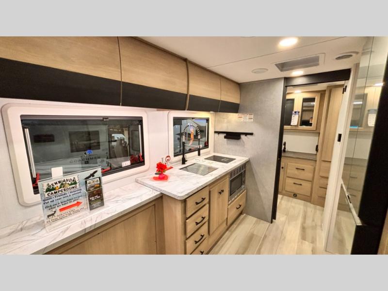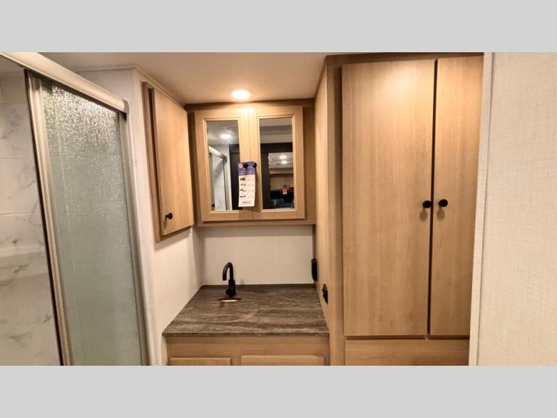 Trips across the state are made cozy in this single slide out coach for two! Once you've parked for the day, you can make lunch on the recessed induction cooktop or in the convection microwave. The sofa slide out provides a place to relax, and the Murphy bed can be folded out when you're ready for some shut-eye. You will appreciate how spacious the full rear bath is, and there is a wardrobe plus a linen closet here for ample storage. The cab-over bunk is only available with the Trekker Cap option; see dealer for more details.