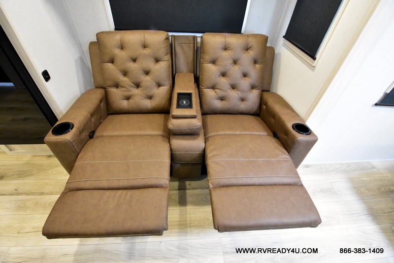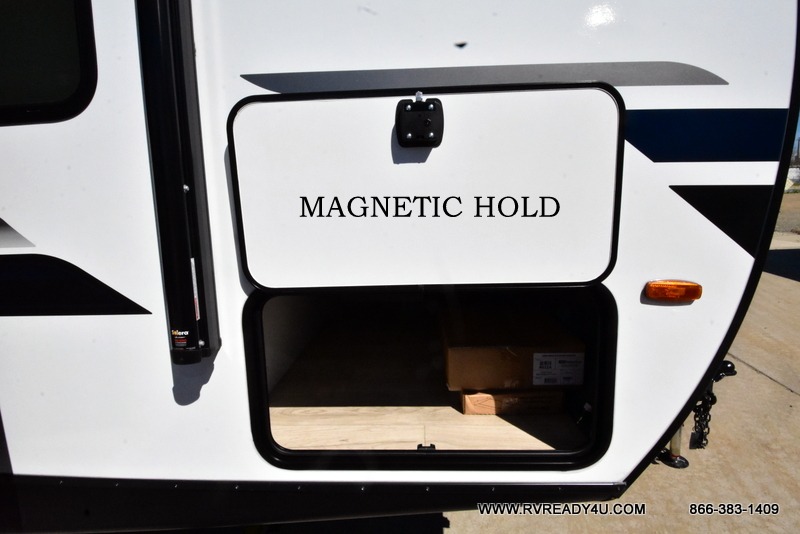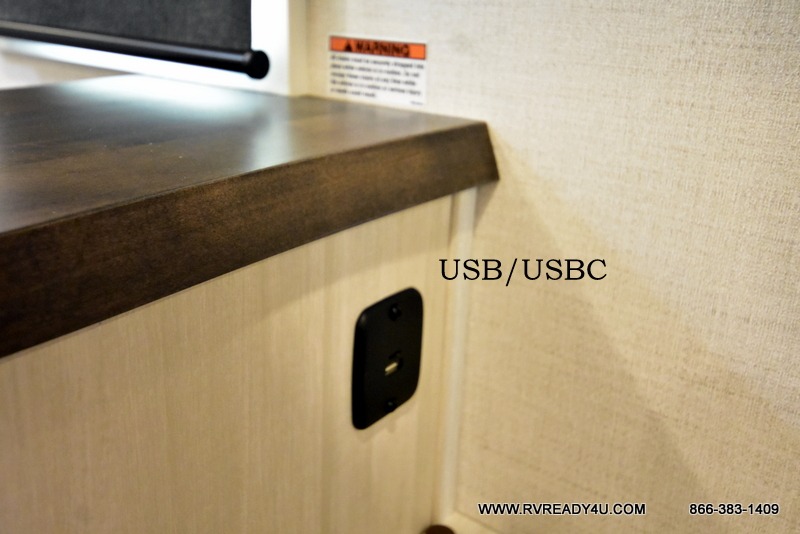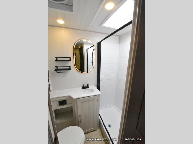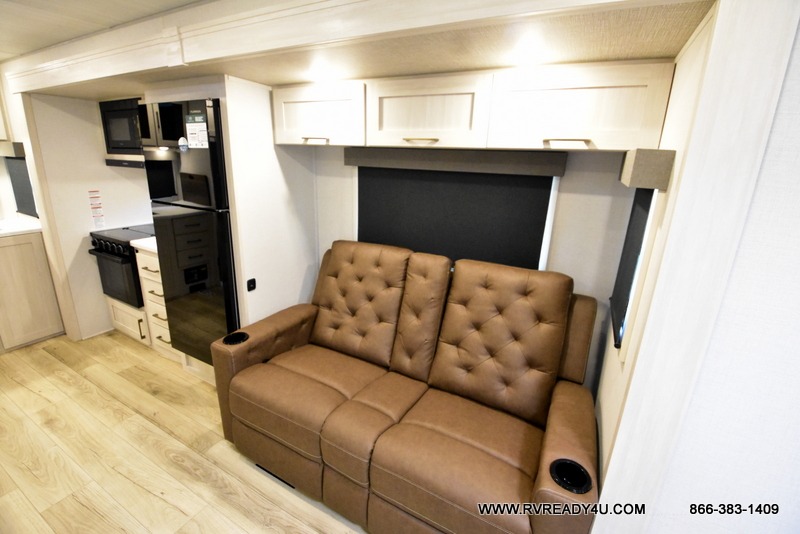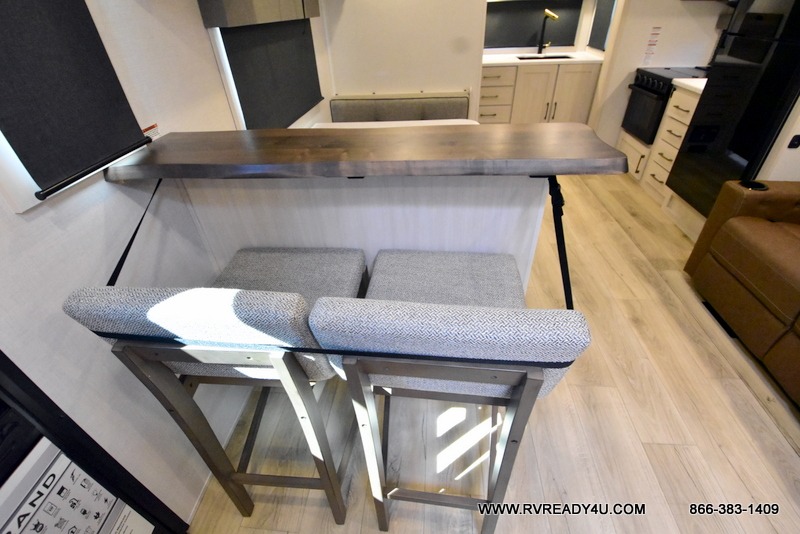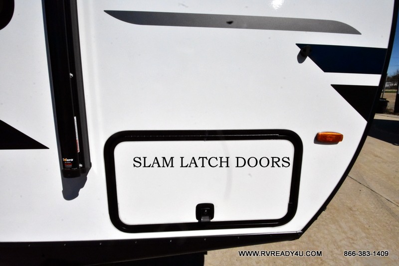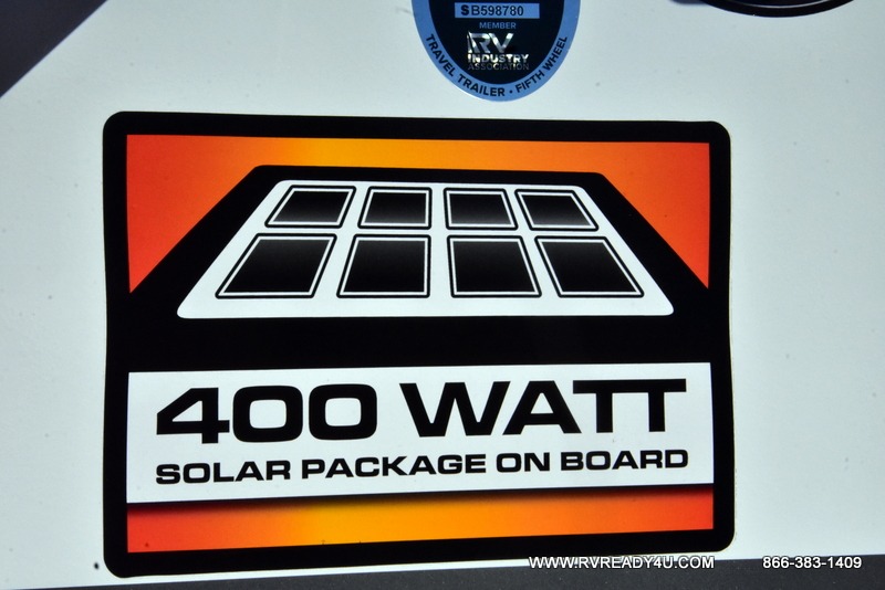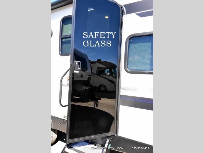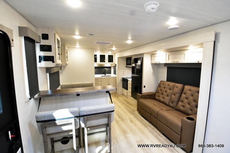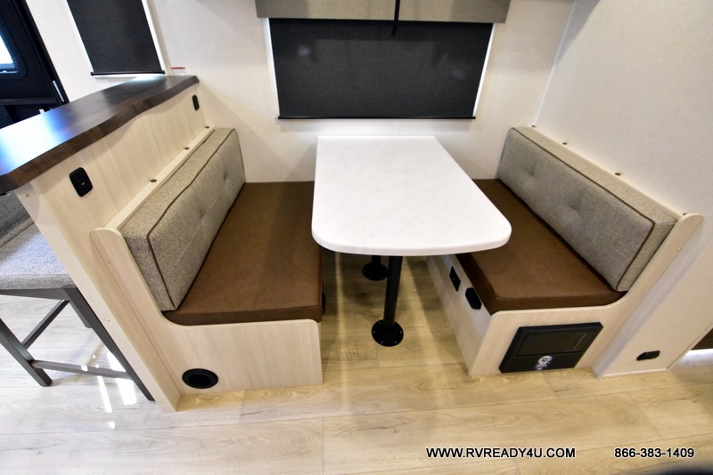 You'll love camping and spending time with loved ones in this spacious travel trailer. The 18' power awning with LED lights can be set up once you arrive at the campground, and you can unload camp gear from the pass-through storage. Head inside to make lunch on the residential range top or in the microwave oven. There is a booth dinette and tri-fold sofa for seating space, plus an additional counter with bar stools beside the dinette. A full bath onboard lets you clean up each day, and the front queen bed is sure to bring a great night's rest. There are also dual wardrobes to keep your space tidy and overhead storage for even more belongings.