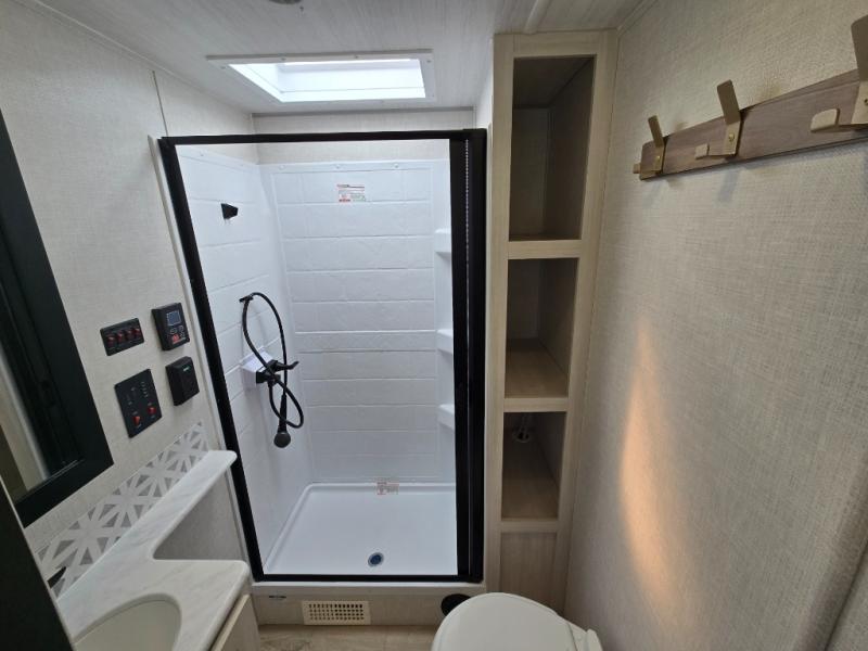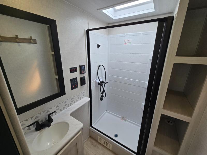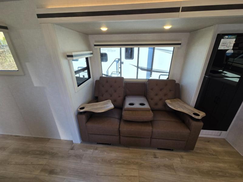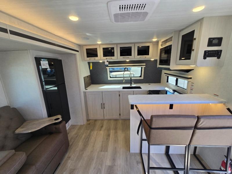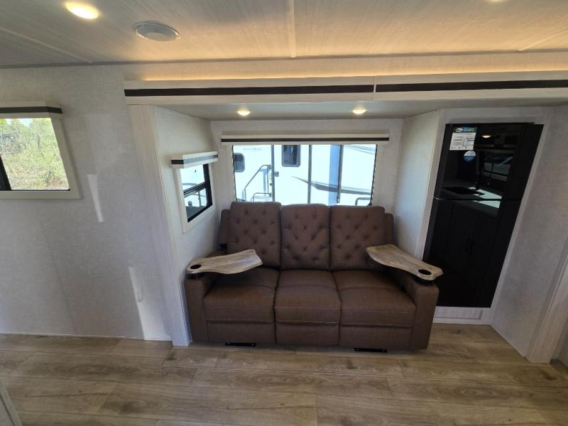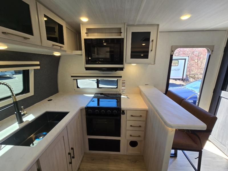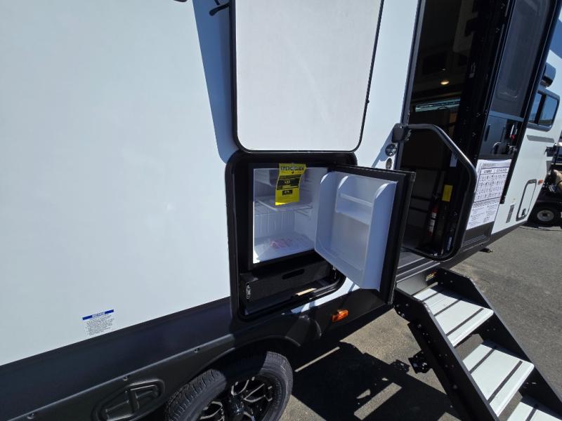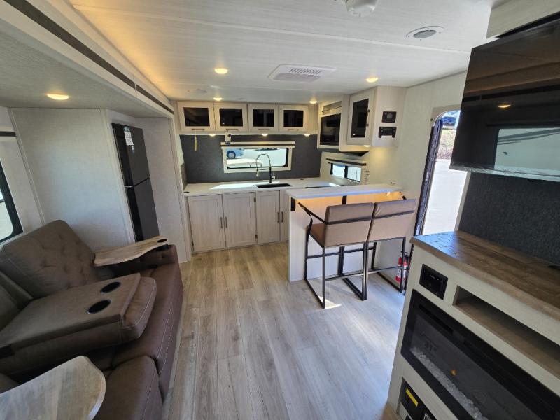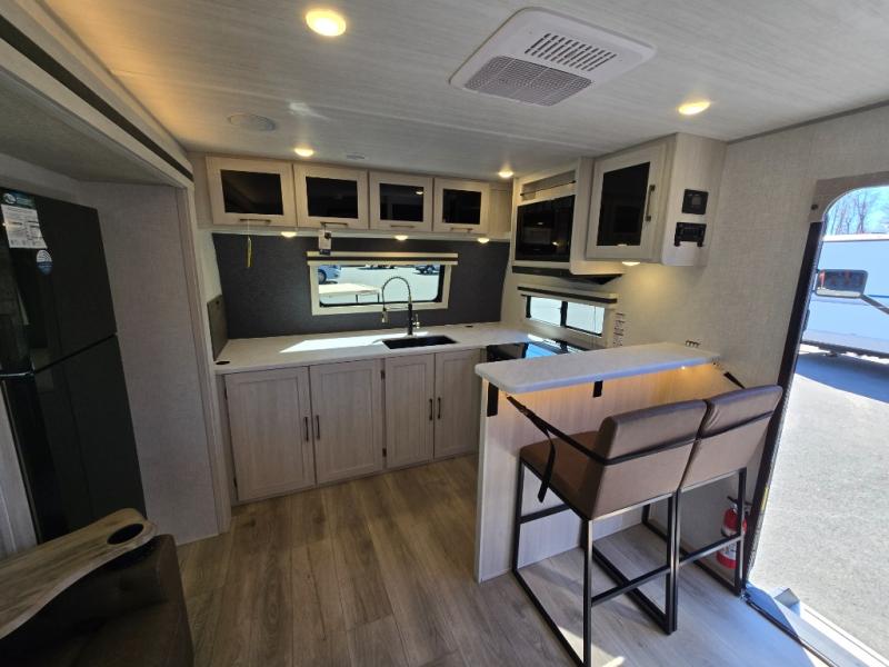 This dual entry, front kitchen travel trailer is perfect for three to four campers. You will have a rear private bedroom with a walk-around queen bed, dual wardrobes, TV prep, plus your own exterior entry door. You'll love relaxing on the theater seating, and if you need more sleeping space, just choose the optional tri-fold sofa or booth dinette in place of this. Preparing meals each day will be a breeze in the front kitchen that includes ample counter space, a residential range top with a glass cover, plus a spacious walk-in pantry. There is also an outside kitchen with a refrigerator, an 18' power awning with LED lights, and a pass-through storage for camp gear!